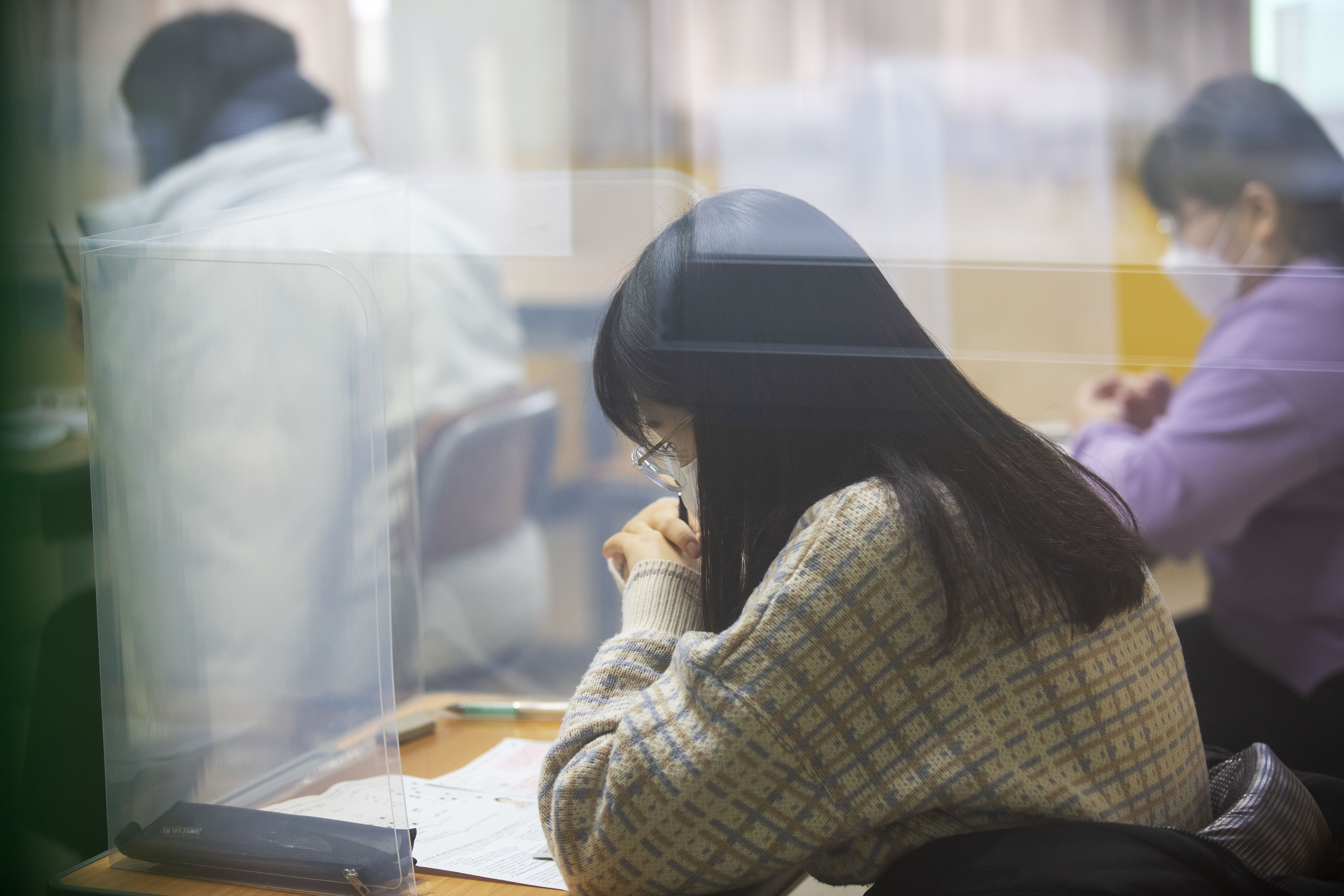 新华社照片,首尔,2022年2月19日 (国际·图文互动)(5)通讯:疫情下汉语水平考试在韩举行 2月19日,在韩国首尔的韩国汉城华侨中学,考生参加汉语水平考试。 (配本社同题文字稿) 新华社记者 王益亮 摄