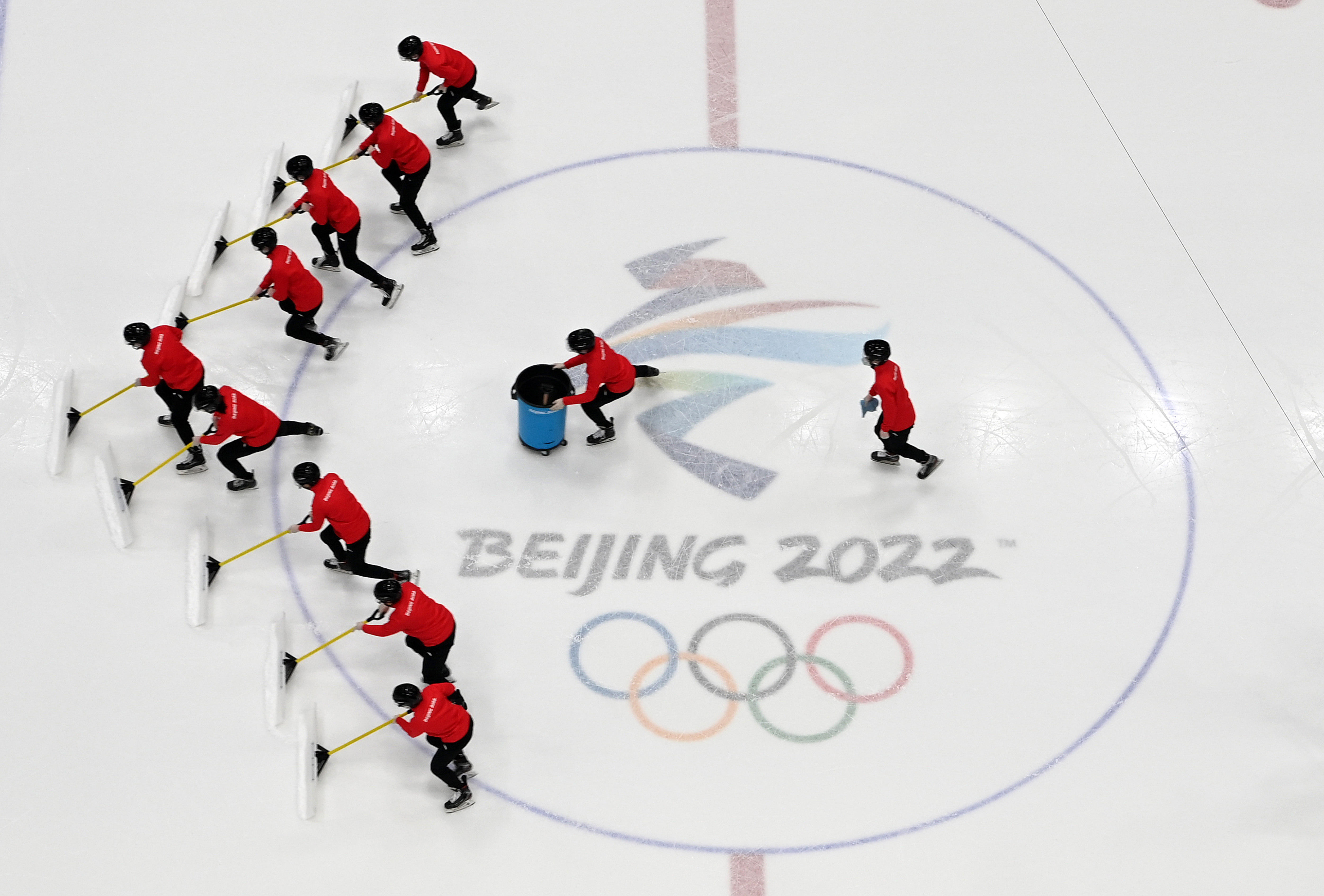 新华社照片,北京,2022年2月19日 (新华全媒头条·图文互动)(3)钟华论:中国携手世界 向着春天出发——写在北京第二十四届冬季奥林匹克运动会闭幕之际 2月15日,志愿者在冰球比赛间隙清理冰面。 (配本社同题文字稿) 新华社记者 李安 摄