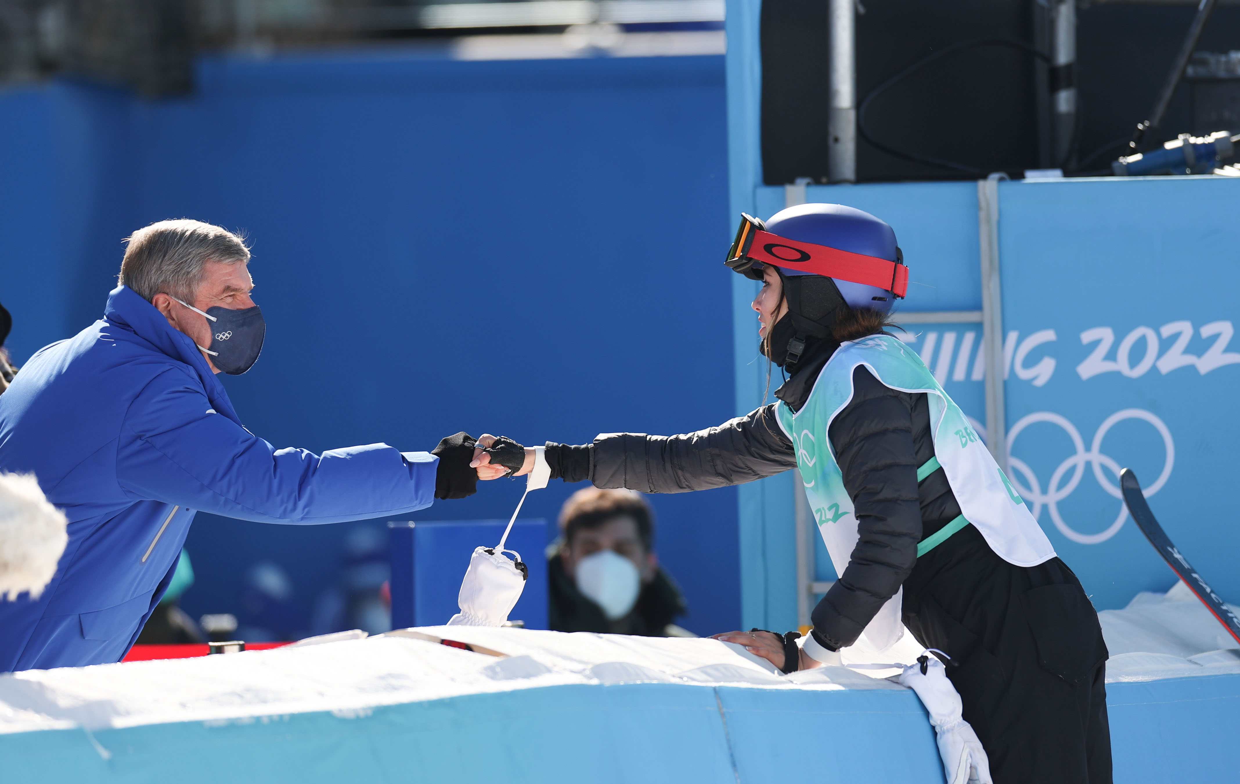 新华社照片,北京,2022年2月19日 (新华全媒头条·图文互动)(4)钟华论:中国携手世界 向着春天出发——写在北京第二十四届冬季奥林匹克运动会闭幕之际 2月8日,国际奥委会主席巴赫(左)向获得自由式滑雪女子大跳台冠军的中国队选手谷爱凌表示祝贺。 (配本社同题文字稿) 新华社记者 丁旭 摄