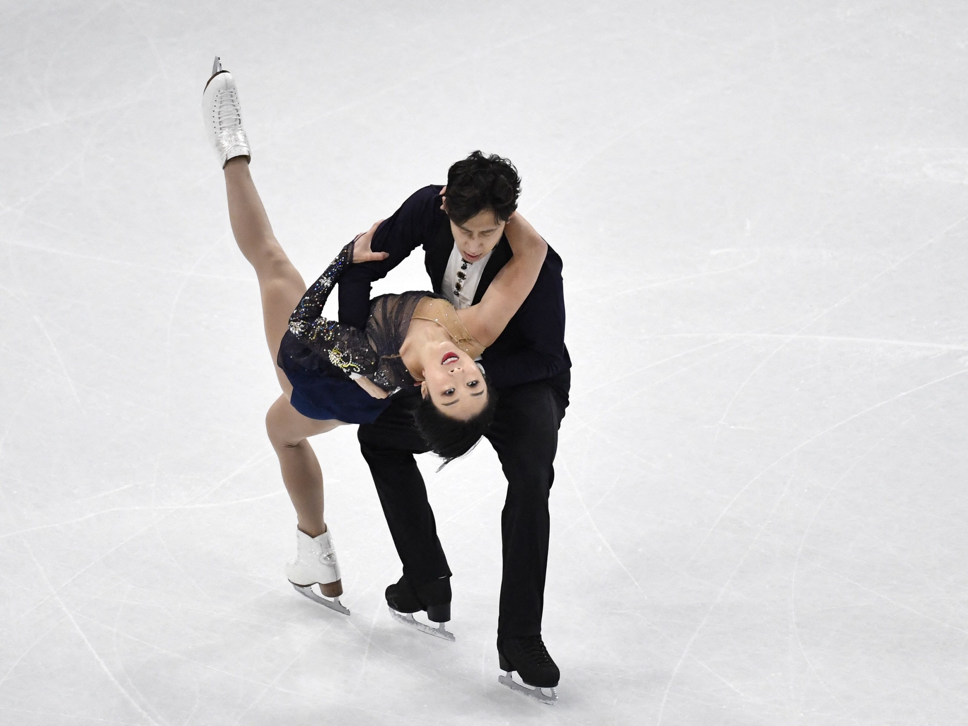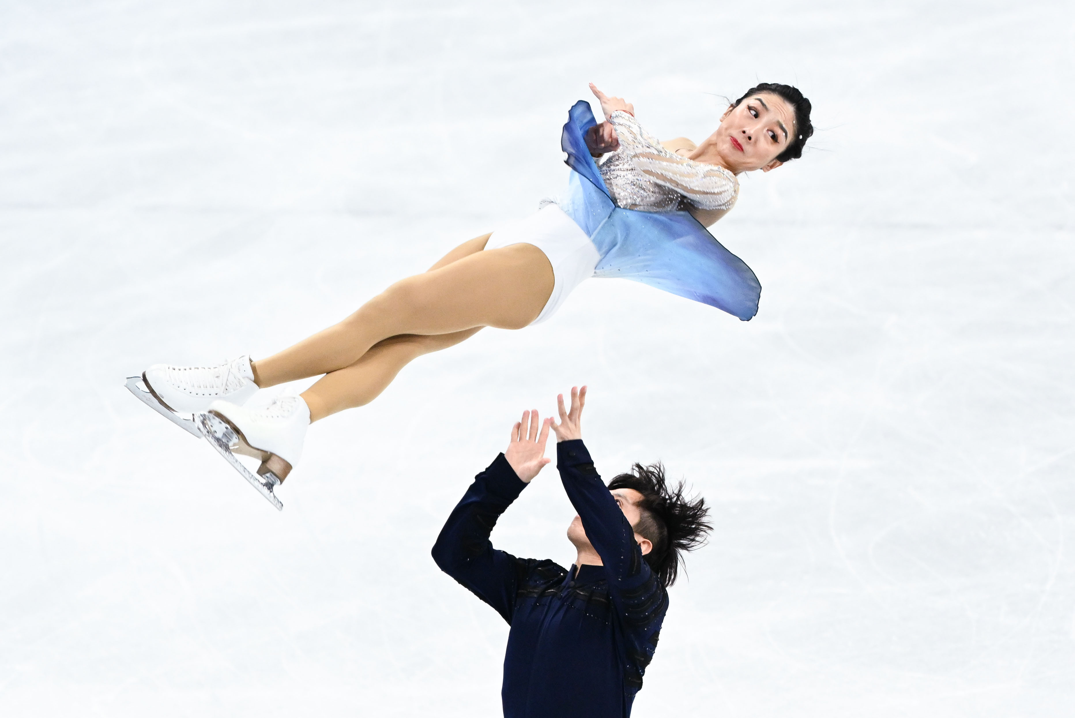 2021年3月24日,中国组合隋文静(下)/韩聪在世界花样滑冰锦标赛双人滑短节目比赛中。新华社/法新
