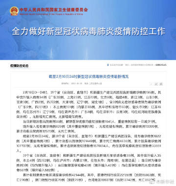 截至2月19日24时,据31个省(自治区、直辖市)和新疆生产建设兵团报告,现有确诊病例1622例(其中重症病例7例),累计治愈出院病例101449例,累计死亡病例4636例,累计报告确诊病例107707例,无现有疑似病例。累计追踪到密切接触者1578614人,尚在医学观察的密切接触者33991人。