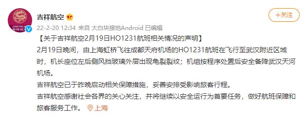 吉祥航空2月20日发布声明称,2月19日晚间,由上海虹桥飞往成都天府机场的HO1231航班在飞行至武汉附近区域时,机长座位左后侧风挡玻璃外层出现龟裂裂纹;机组按程序处置后安全备降武汉天河机场。吉祥航空已于19日晚启动相关保障措施,妥善安排受影响旅客行程。