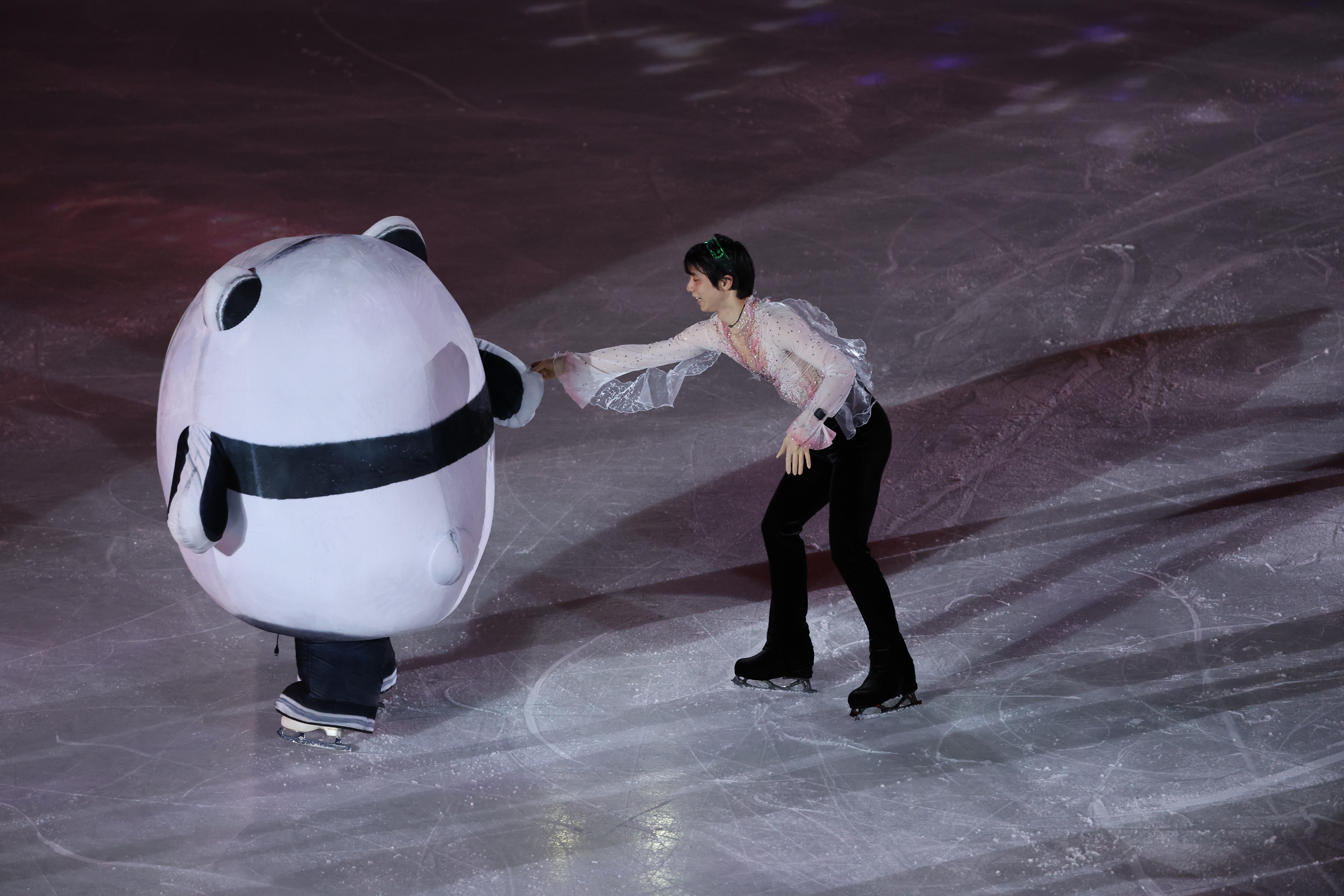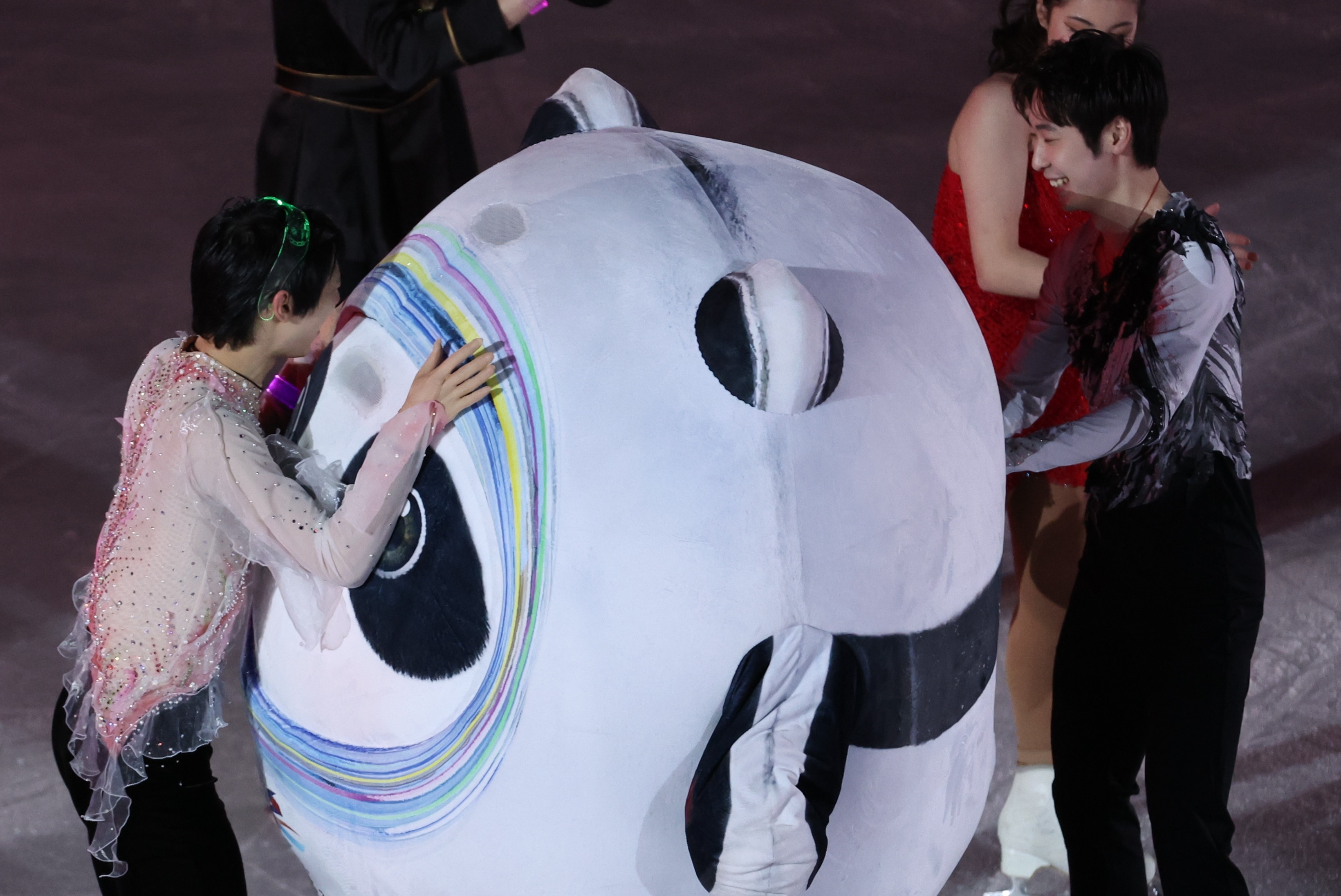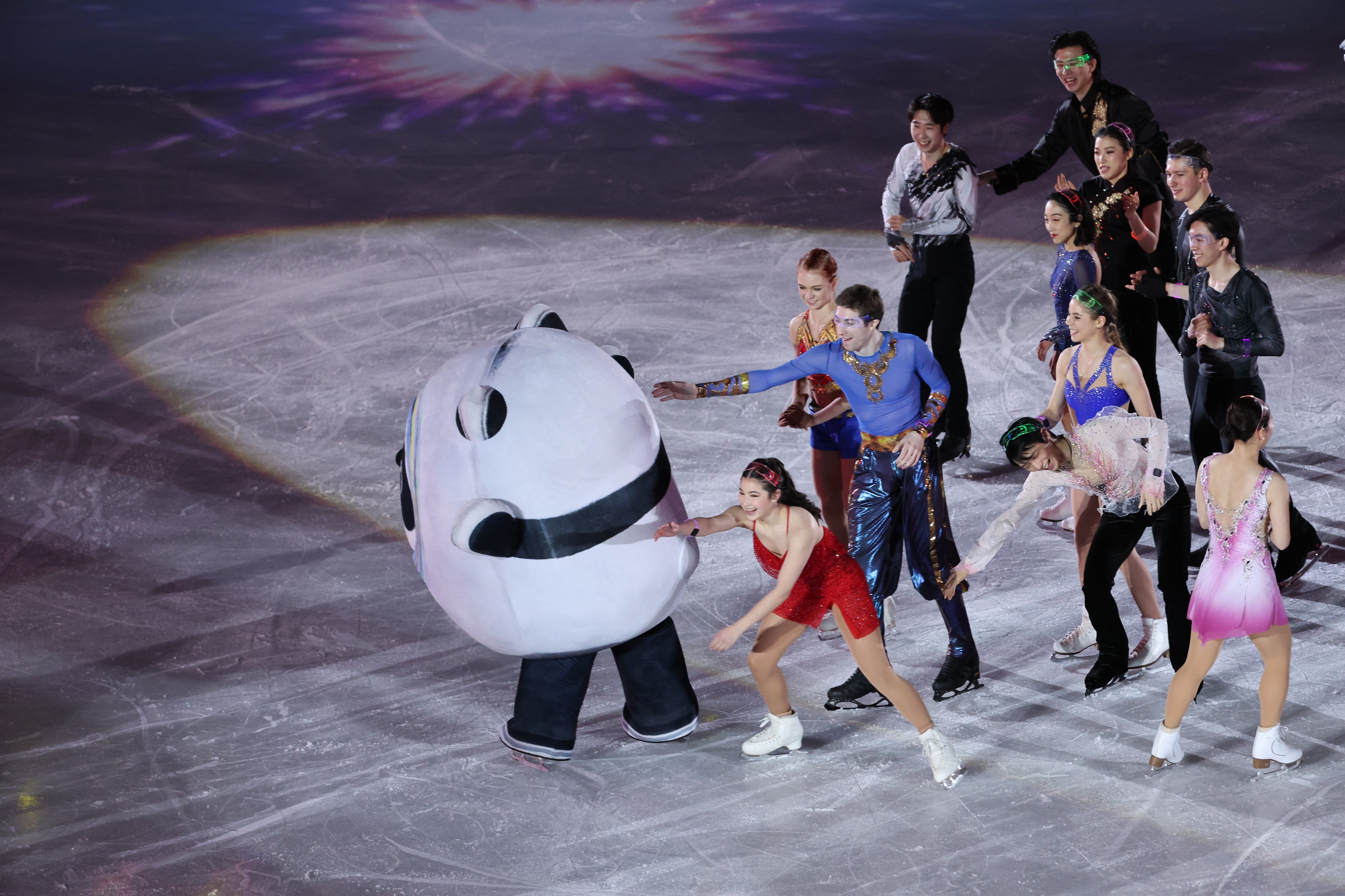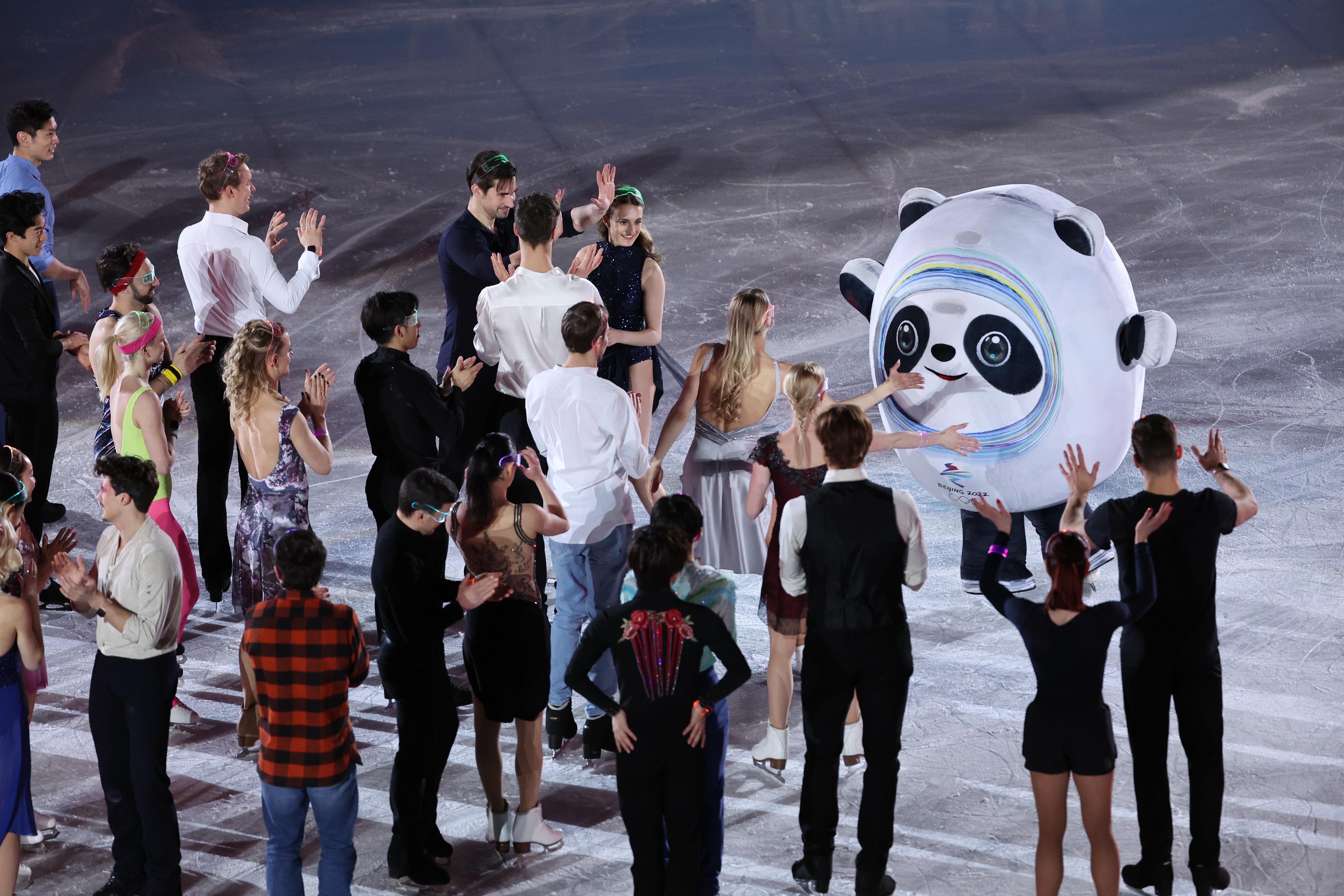 20日进行的花滑表演赛,隋文静/韩聪最后一组压轴亮相,随后冰墩墩入场,在众多花滑选手保护下仍然多次摔倒。