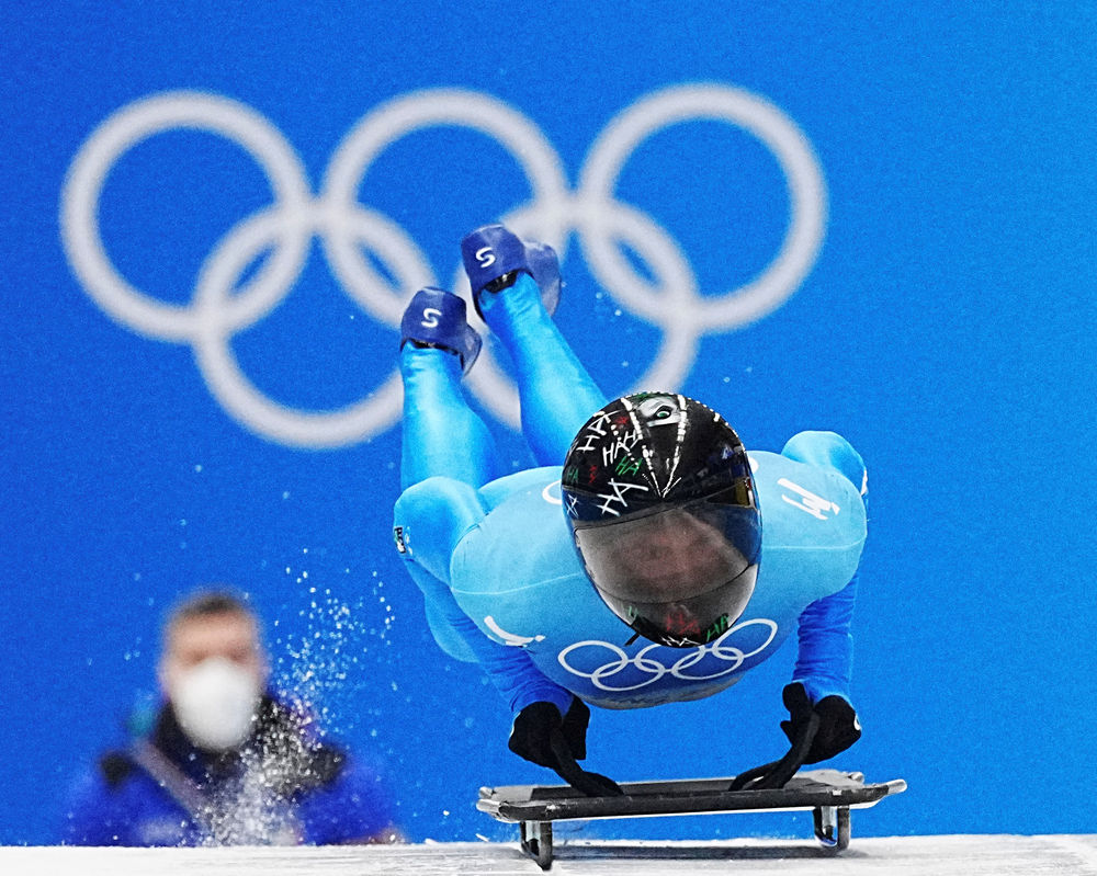 2月11日,意大利选手阿梅代奥·巴尼斯在比赛中出发。当日,北京2022年冬奥会男子钢架雪车比赛在国家雪车雪橇中心举行。新华社记者 贺长山 摄