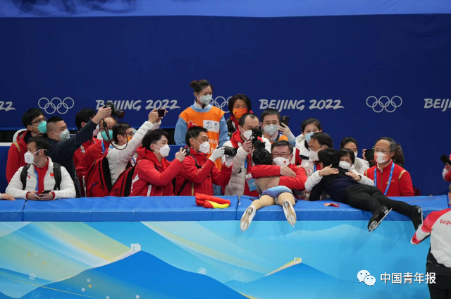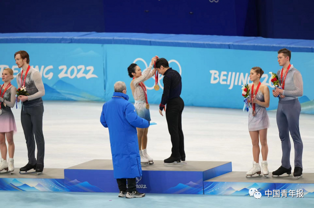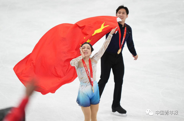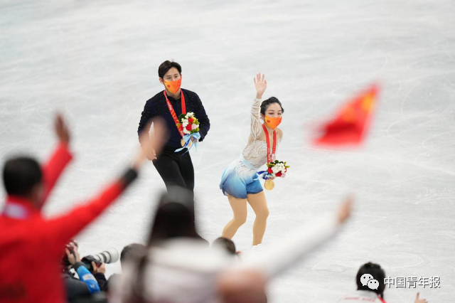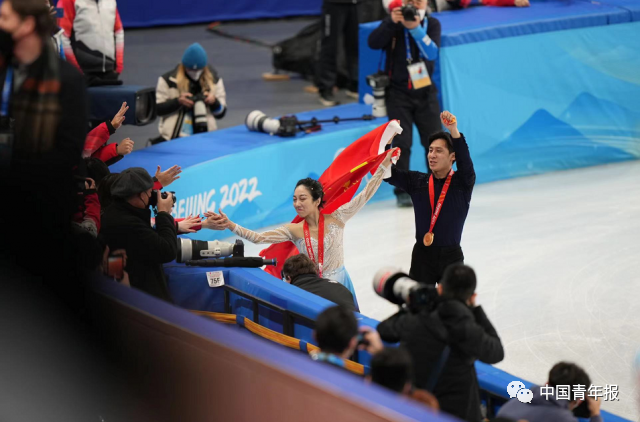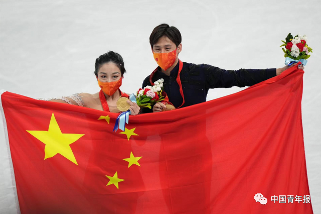 昨晚,隋文静/韩聪夺冠现场的这面国旗,就是1月25日中国体育代表团誓师出征时,天安门广场升起的那面五星红旗!这是天安门国旗班送给中国队的祝福!观众席合唱《歌唱祖国》,共同庆祝这一历史时刻!