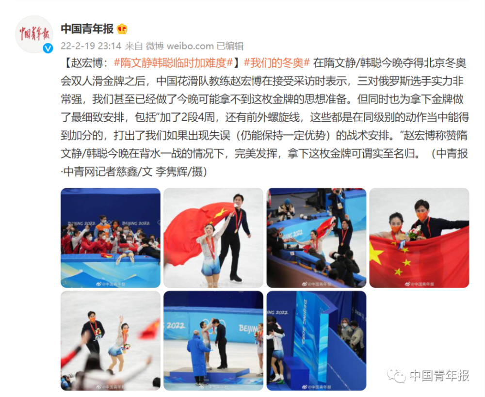 赵宏博表示,三对俄罗斯选手实力非常强,我们甚至已经做了可能拿不到这枚金牌的思想准备。但同时也为拿下金牌做了最细致安排,包括“加了2段4周,还有前外螺旋线,这些都是在同级别的动作当中能得到加分的,打出了我们如果出现失误(仍能保持一定优势)的战术安排。”赵宏博称赞隋文静/韩聪今晚在背水一战的情况下,完美发挥,实至名归地拿下这枚金牌。