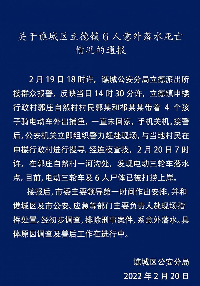 2月20日,亳州市公安局谯城分局通报立德镇6人意外落水死亡情况。通报称,2月19日18时许,谯城公安分局立德派出所接群众报警,反映当日14时30分许,立德镇申楼行政村郭庄自然村村民郭某和祁某某带着4个孩子骑电动车外出捕鱼,一直未回家,手机关机。接警后,公安机关立即组织警力赶赴现场,与当地村民在申楼行政村进行搜寻。经连夜查找,2月20日7时许,在郭庄自然村一河沟处,发现电动三轮车落水点。目前,电动三轮车及6人尸体已被打捞上岸。