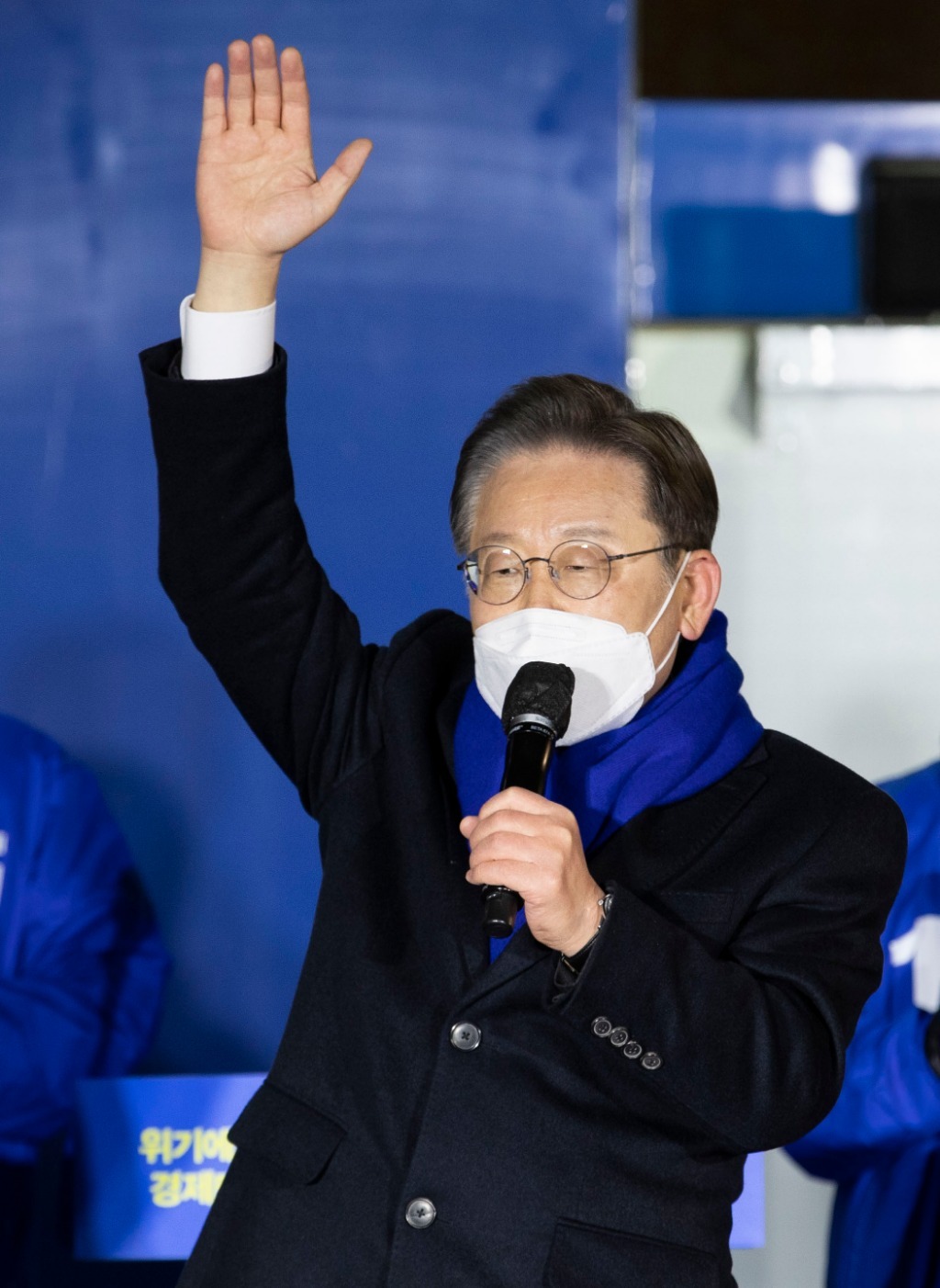 2月15日,韩国总统候选人李在明在首尔参加竞选活动。(新华社发,李相浩摄)