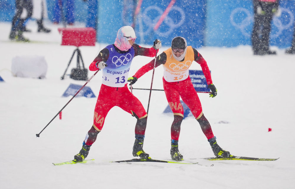 2月13日,中国队选手王强(右)在越野滑雪男子4x10公里接力比赛中和队友陈德根交接。新华社记者牟宇摄