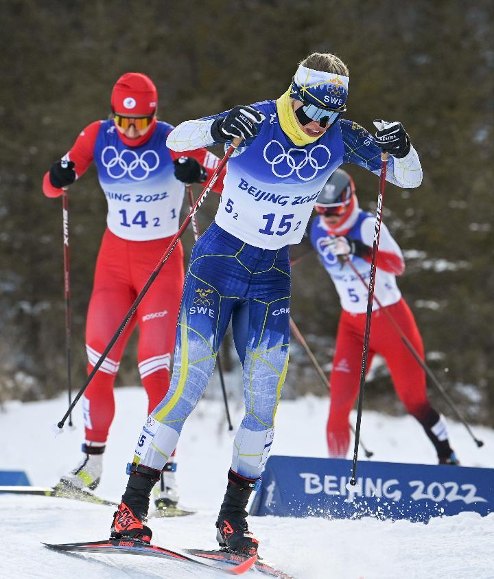 2月16日,瑞典队选手约娜·松德林(前)在冬奥会越野滑雪女子团体短距离(传统技术)比赛决赛中。新华社记者胡虎虎摄