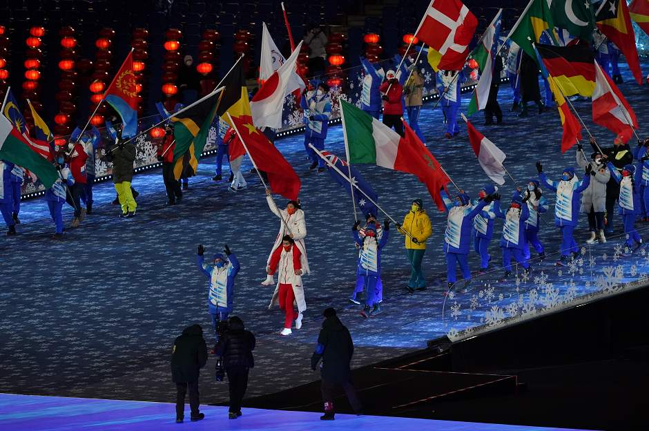 此刻,运动员入场!天上地下都由巨大的中国结线条包裹,既表达中国与世界的连接,也寄托着全世界在一起、“更团结”的奥林匹克精神。友谊长存,一起向未来!