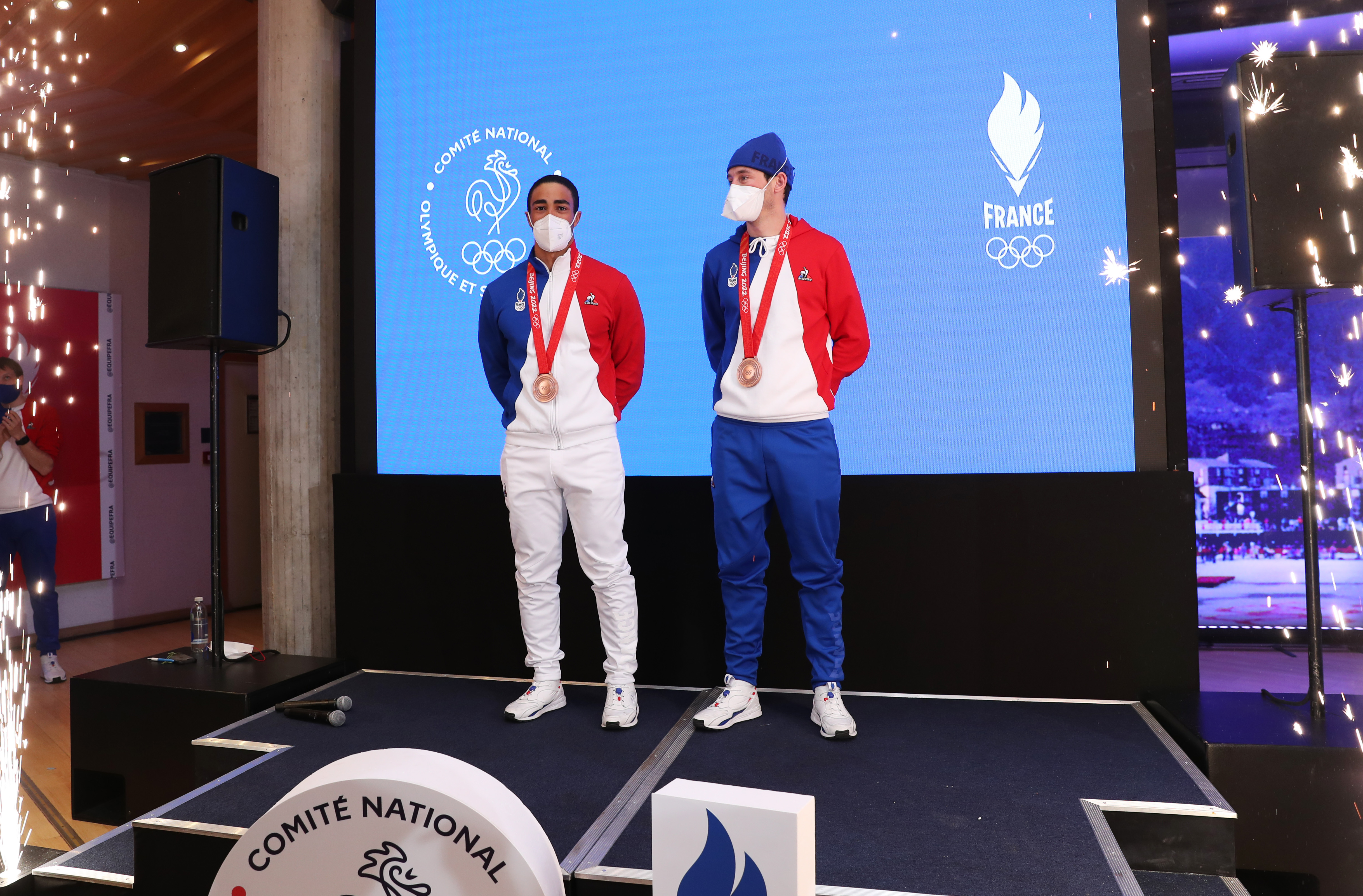 2月17日,拉帕吕(右)与队友在巴黎的法国奥委会总部亮相。新华社记者高静摄