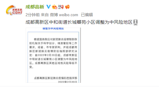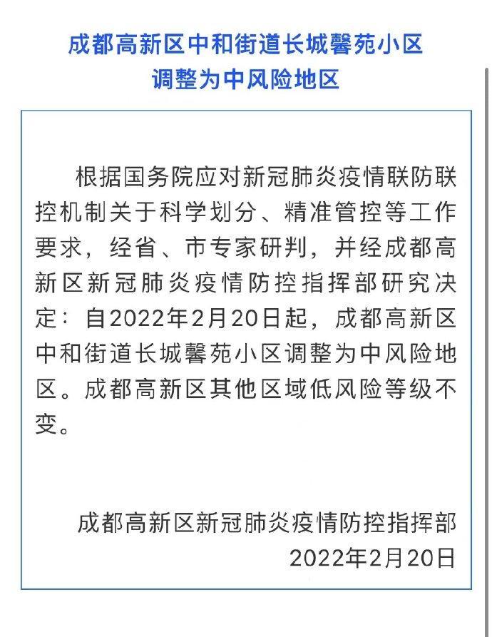 成都高新区中和街道长城馨苑小区调整为中风险地区