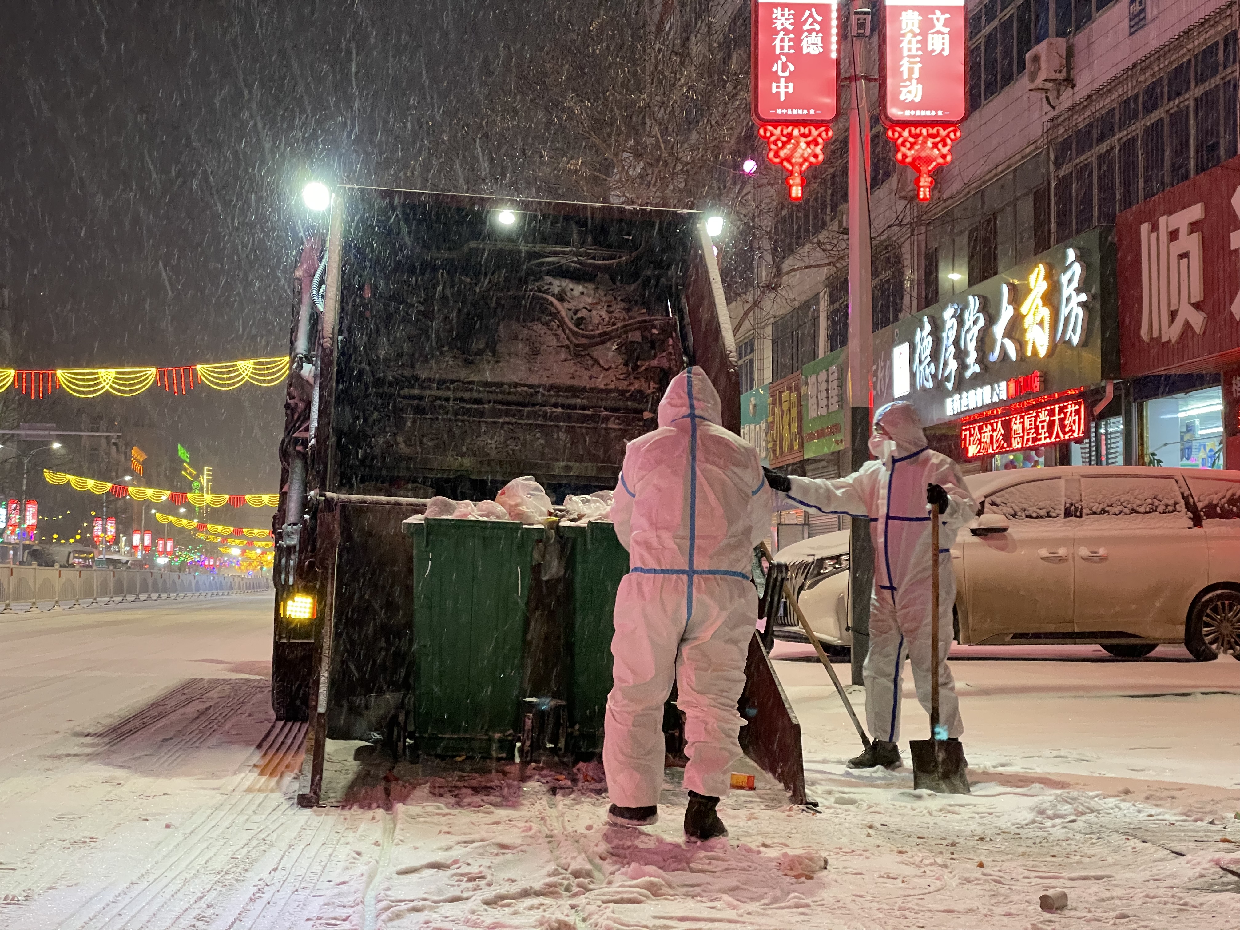环卫工人在雪夜里清理生活垃圾。(新华社记者李昂 摄)
