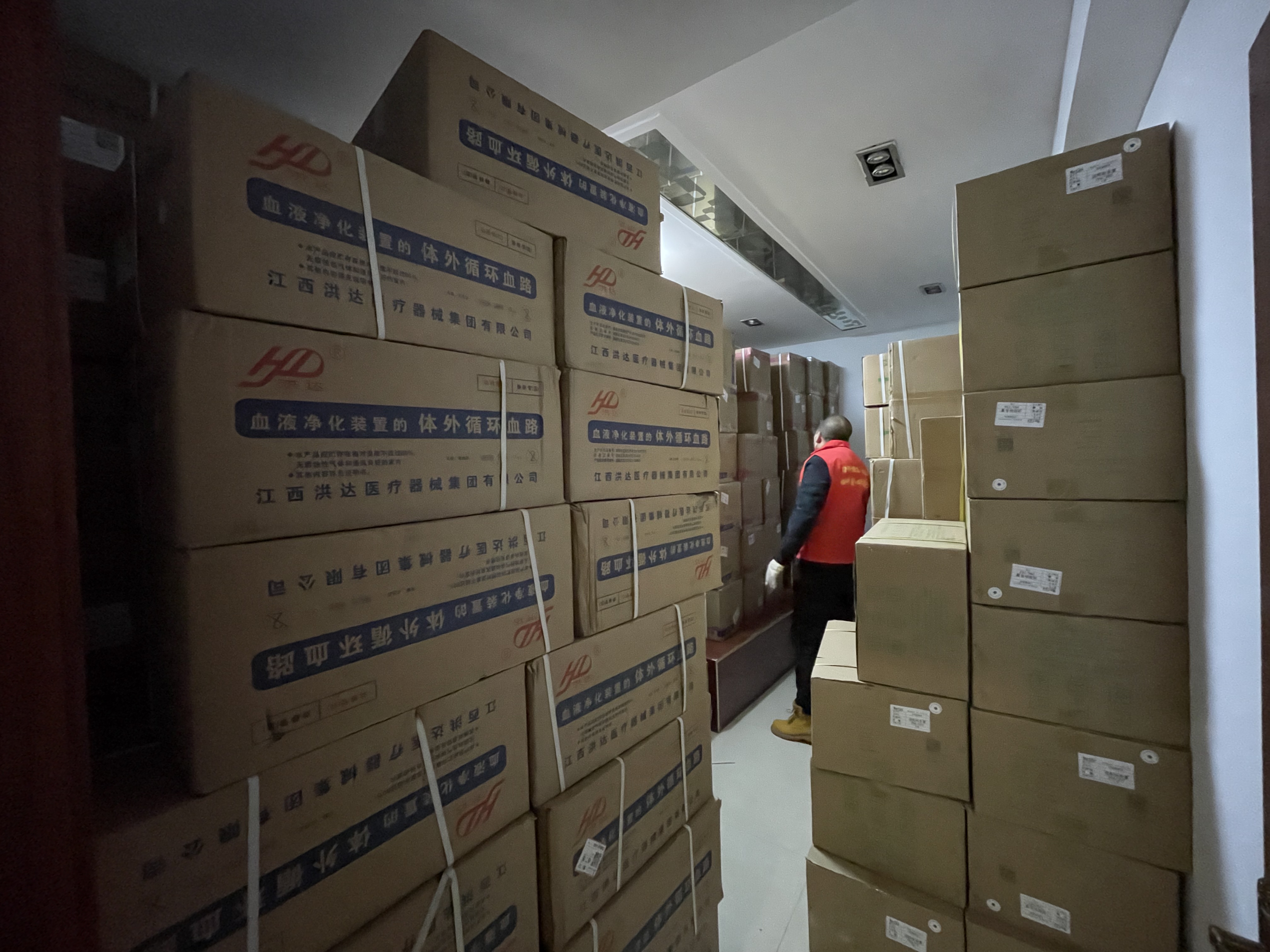 志愿者在一处物资储备仓库清点物资。(新华社记者李昂 摄)