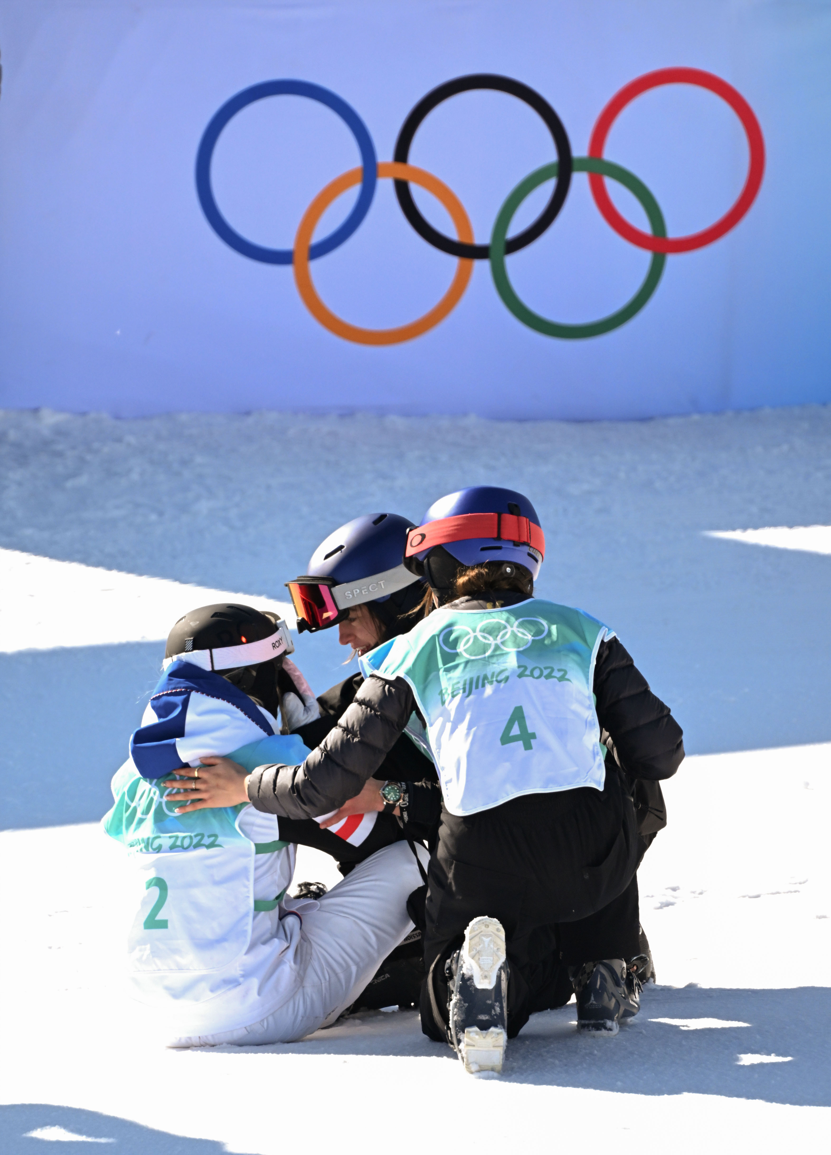 新华社照片,北京,2022年2月20日 (新华全媒头条·图文互动)(9)非凡的冰雪盛会 精彩的中国答卷 2月8日,中国队选手谷爱凌(右)和瑞士队选手玛蒂尔德·格雷莫德(中)在比赛后安慰法国队选手泰丝·勒德。 (配本社同题文字稿) 新华社记者 武巍 摄