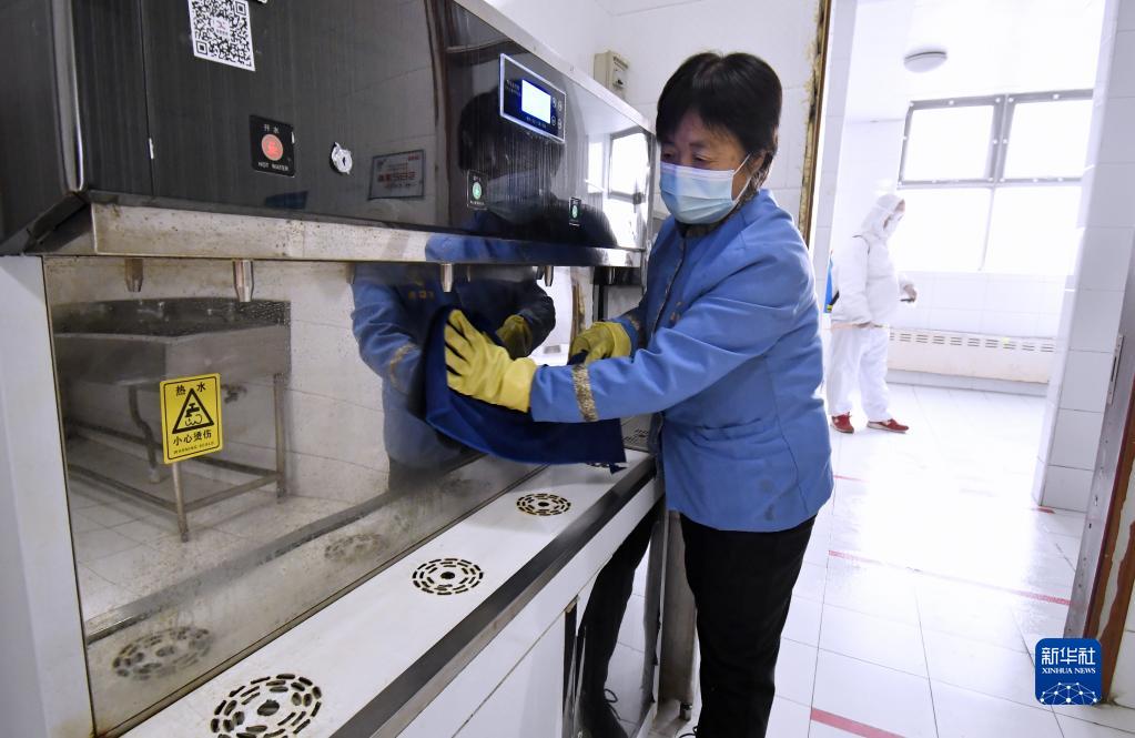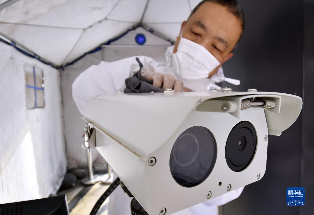 2月20日,在北京市航天中学,防疫人员在检测和清洁测温设备。新华社记者 李欣 摄