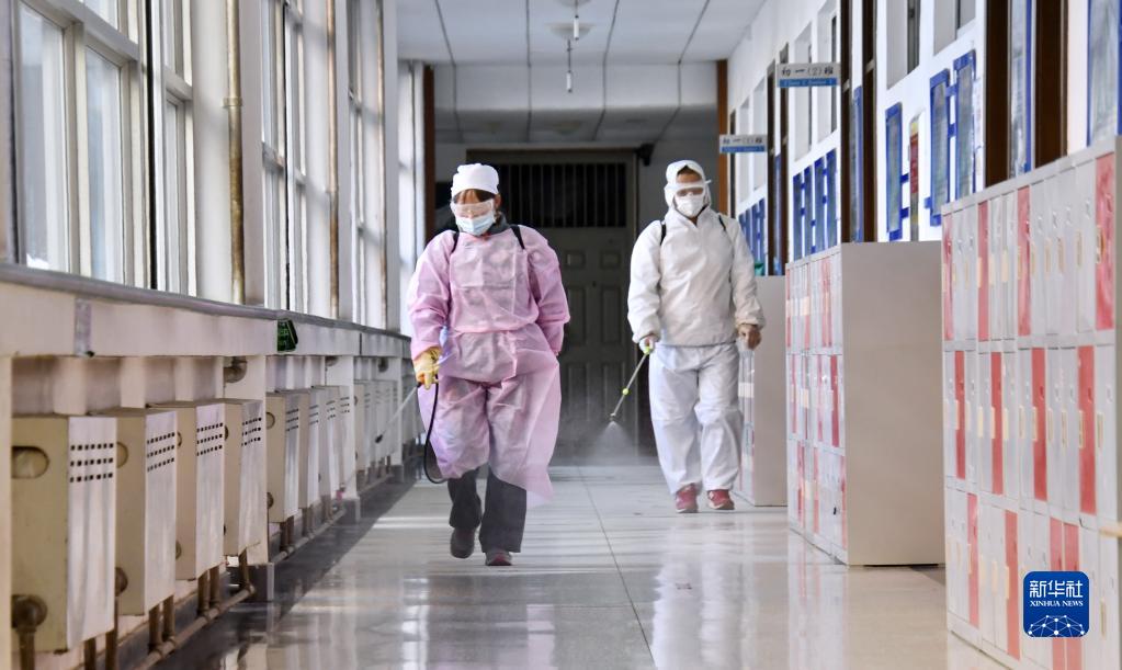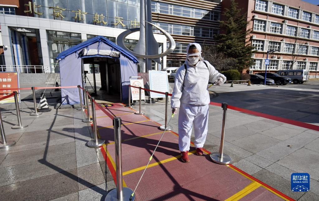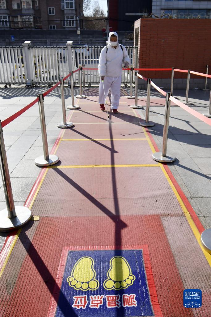 2月20日,在北京市航天中学,防疫人员对入校测温通道进行消毒。新华社记者 李欣 摄