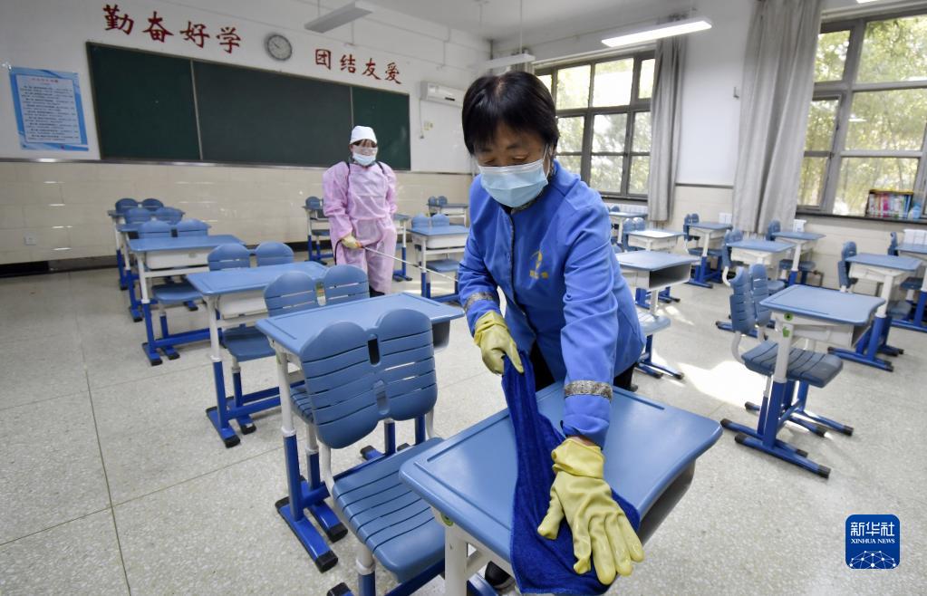 2月20日,在北京市航天中学,防疫人员对教室内的教学设施进行消毒。新华社记者 李欣 摄