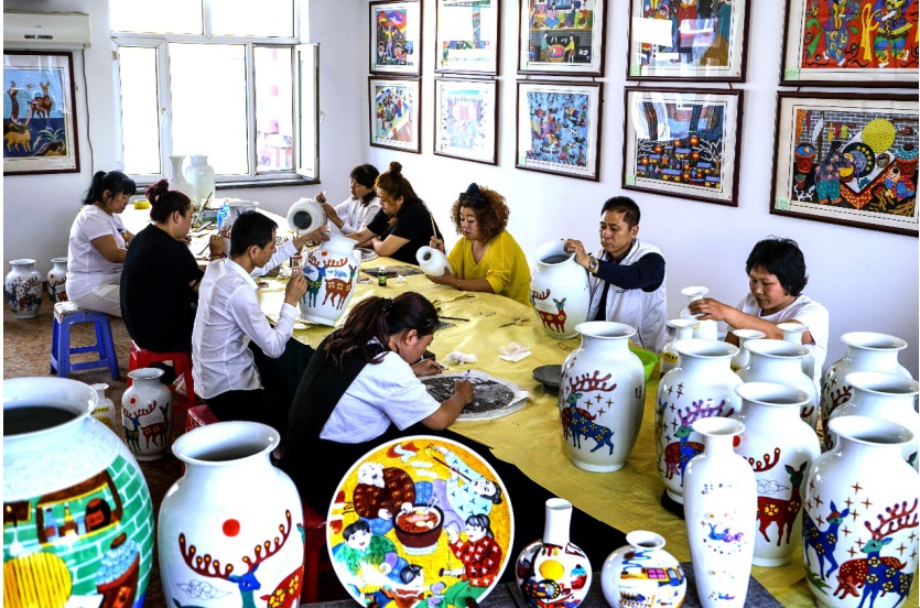 绘制公益宣传画、主题定制作画、农民画墙、陶瓷农民画……农民画从作品变成销售产品,从农村走进机关、企业和市民家里。东丰县依托各方力量,聚拢人才、打通农民画销售渠道。