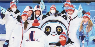 2月14日,参加北京冬奥会的运动员在颁奖广场与“冰墩墩”合影。 新华社记者 丁 汀摄 |