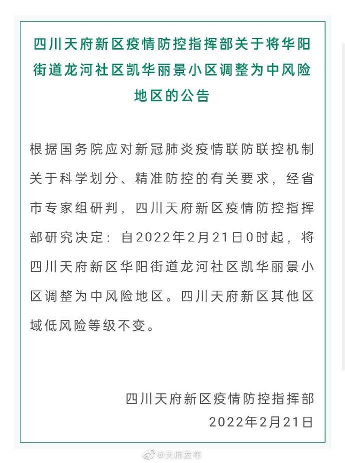 据天府发布微博消息,2月21日,四川天府新区管理委员会官方微博发布四川天府新区疫情防控指挥部关于将华阳街道龙河社区凯华丽景小区调整为中风险地区的公告。公告全文如下: