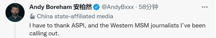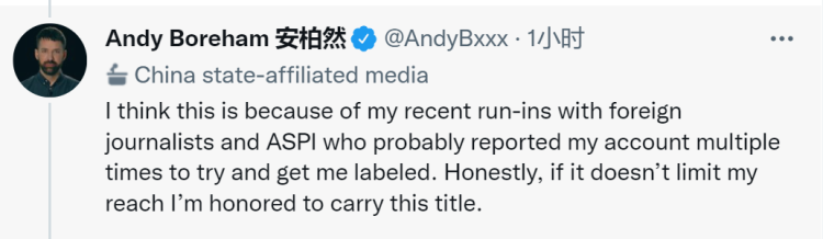 安柏然回复称,“我觉得这是因为我最近与一些外国记者和澳大利亚战略政策研究所有过争执,他们可能多次报道过我的账号,试图让我被贴上标签。说实话,如果这不限制我使用,我很荣幸能获得这一头衔。”↓
