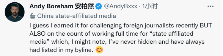 已经在中国生活十年的Andy Boreham(中文名安柏然)是一名新西兰人,目前在上海日报任职,在复旦大学留学期间,他有过在多家中国媒体实习的经历。“不是吹捧中国的投机者,而是讲述事实的媒体人”一直都是他在社交平台推特上的自我介绍。