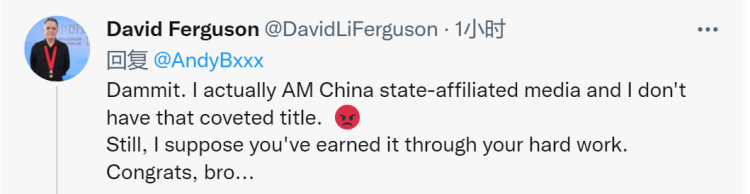 来自英国的大卫·弗格森是中国外文局外文出版社资深翻译改稿专家,他也在安柏然这条推文下评论,“该死的。我实际上才是中国官方媒体,我却没有那个令人垂涎的头衔。不过,我想这是你辛苦工作换来的。恭喜,兄弟……”↓