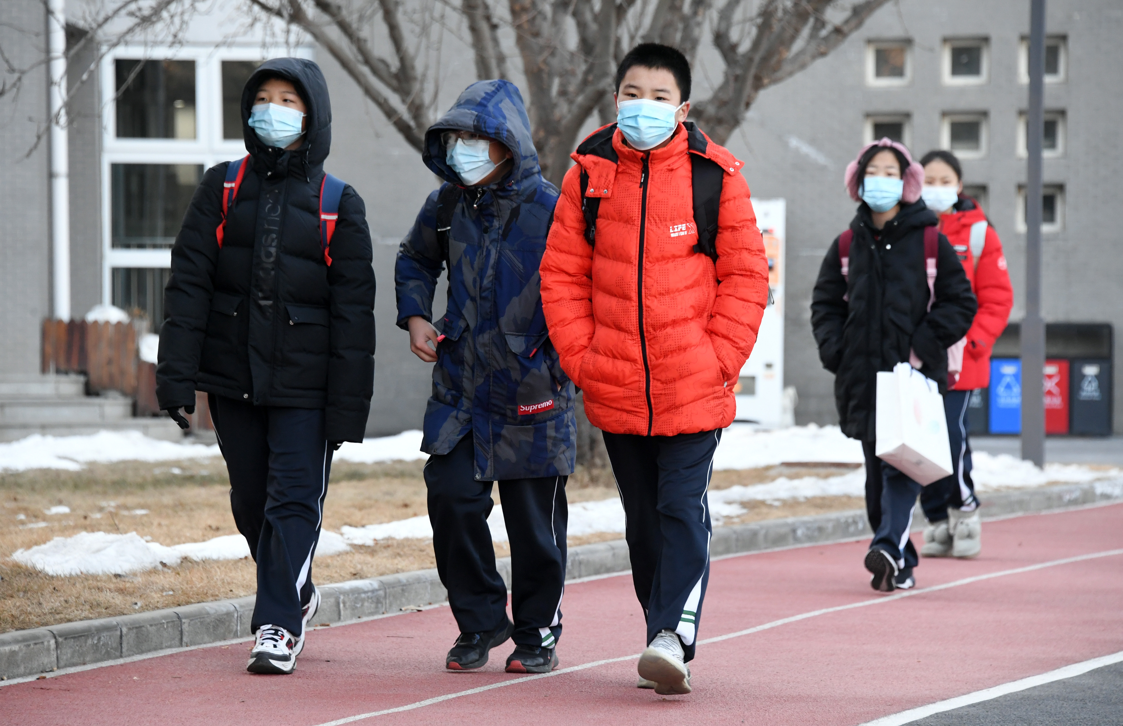 新华社照片,北京,2022年2月21日 北京市中小学开学 2月21日,学生们走在中国农业大学附属中学校园里。 当日,北京市中小学开学。 新华社记者 任超 摄