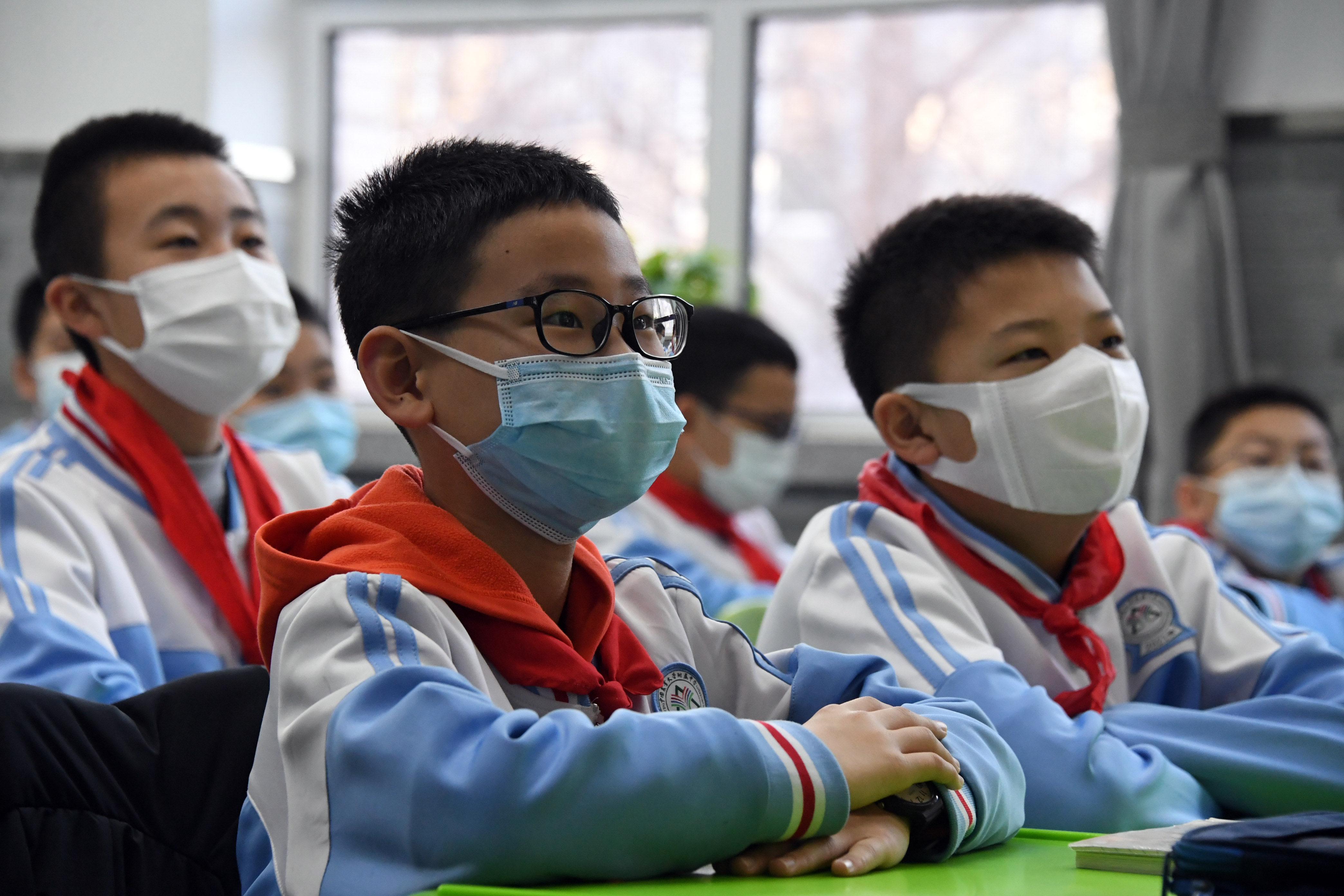 新华社照片,北京,2022年2月21日 北京市中小学开学 2月21日,中国农业大学附属中学初一(5)班的学生们在上数学课。 当日,北京市中小学开学。 新华社记者 任超 摄