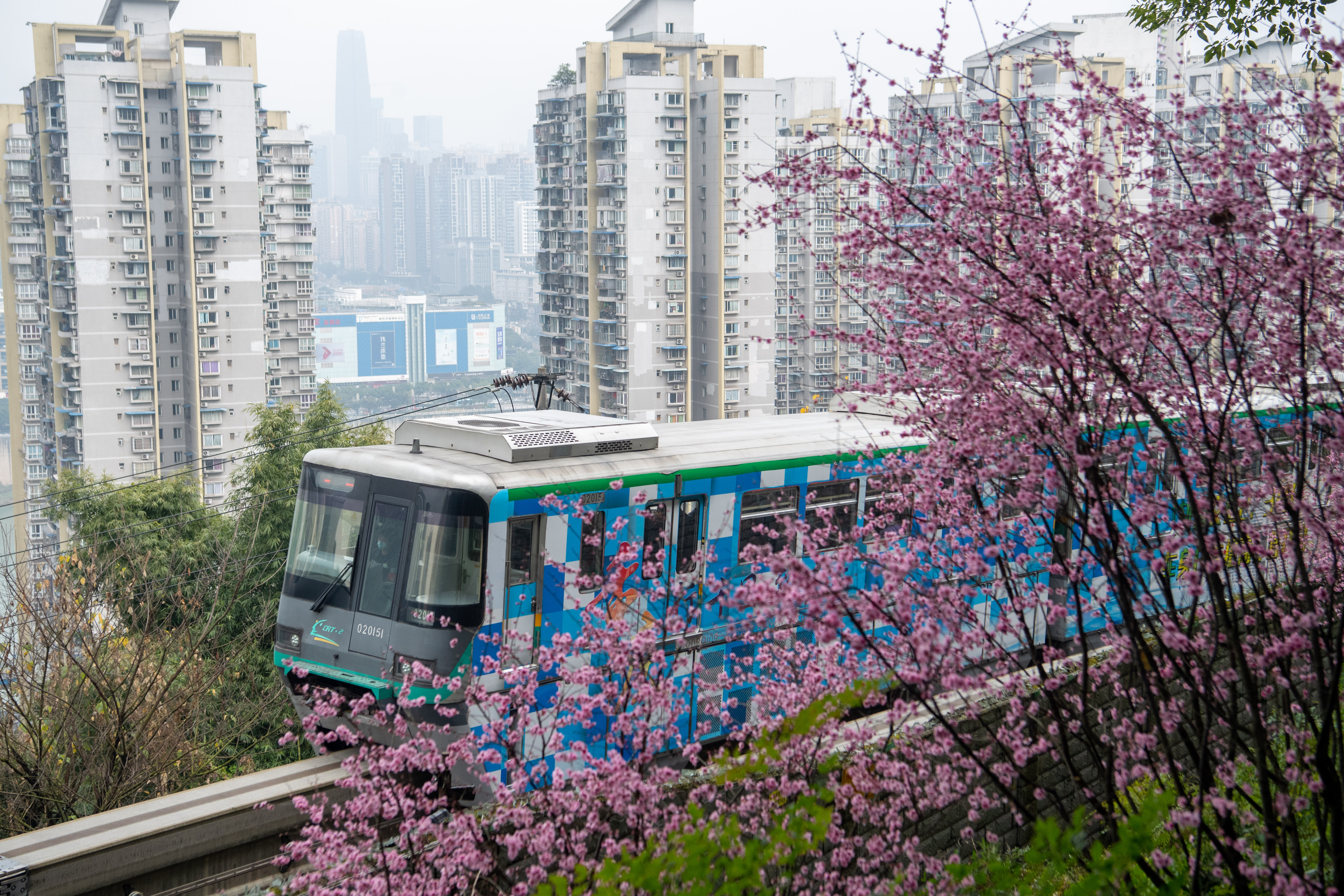 其实,这趟“开往春天的列车”是重庆单轨2号线,之前已凭借其在李子坝站的“穿楼”景观,成为重庆著名景点。后来,因为佛图关公园的鲜花盛开,李子坝站到佛图关站之间的轨道来回穿梭于花丛中,单轨2号线又再次走红。