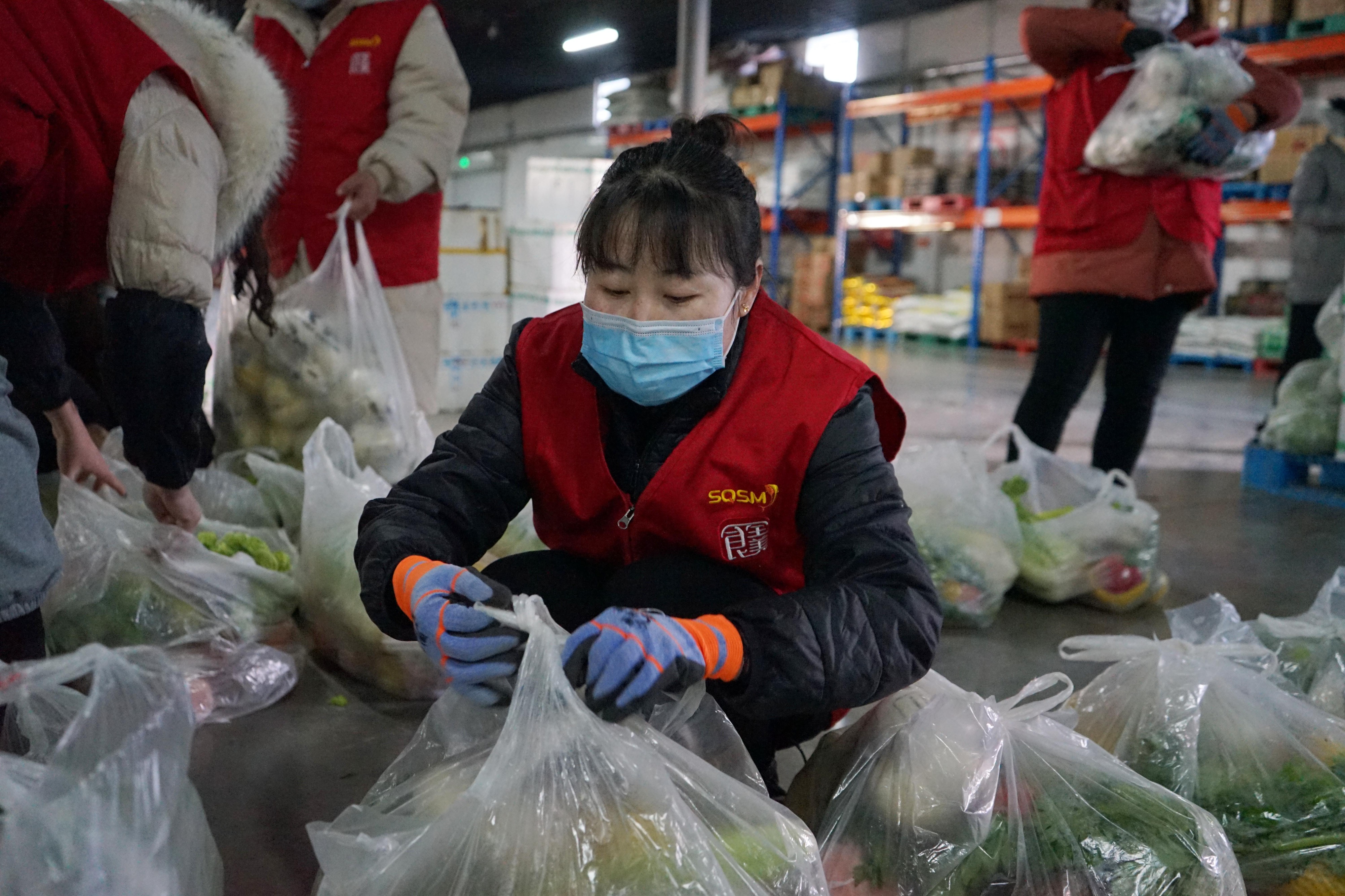 20日上午9点,在内蒙古食全食美股份有限公司一个生鲜物流配送中心的果蔬分拣区,白色的塑料袋整齐划一地摆出几米远,商品物流配送有限责任公司经理彭庆峰和同事们快速将白菜、洋葱、苹果等新鲜蔬菜、水果分拣打包。随后,这些打包好的果蔬就会被送上运输车辆,送至封控小区的住户手中。企业每天从早上6点开始运转,直到晚上11点才能完成一天的保供任务。