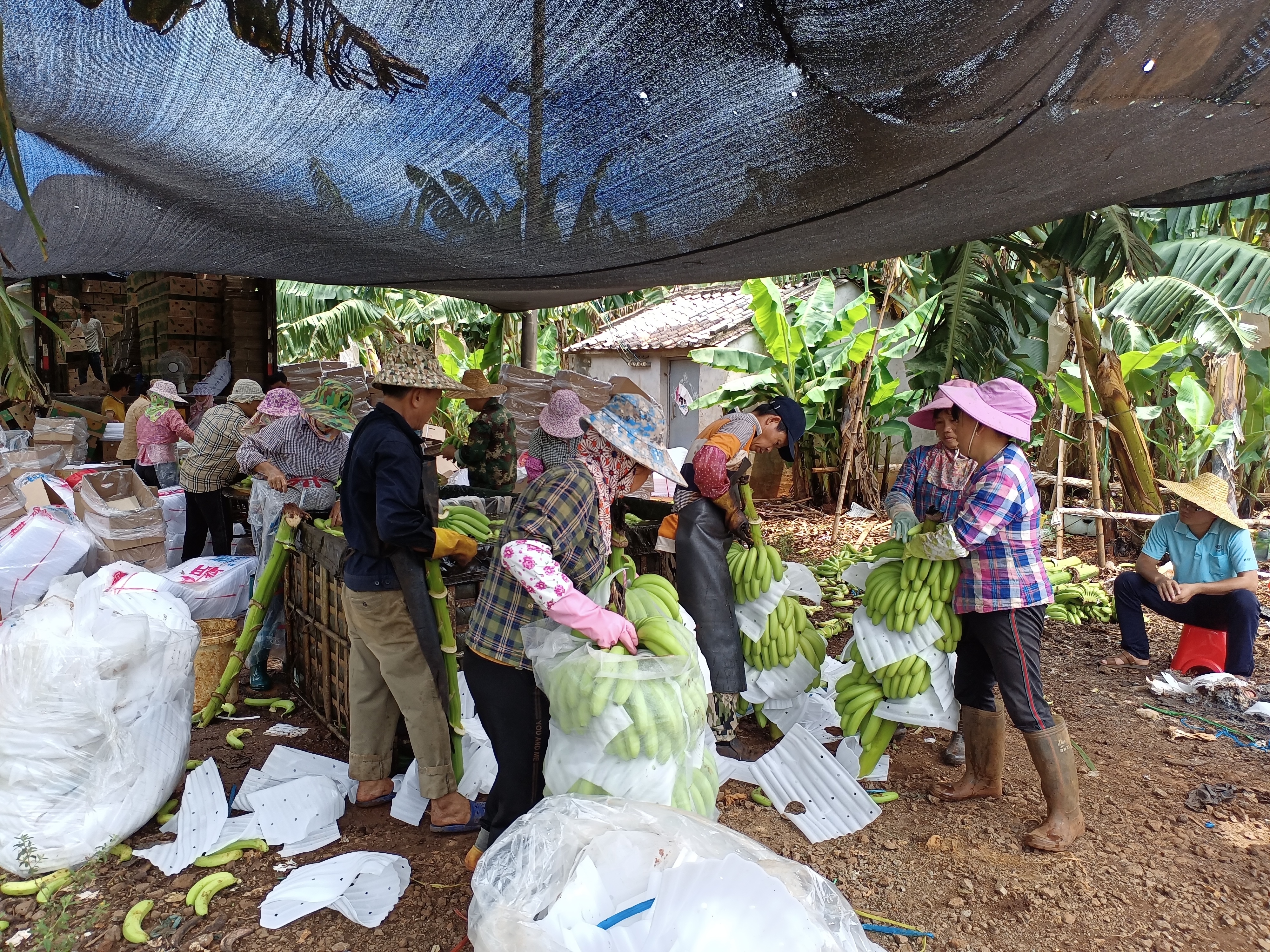 王海管理的千亩香蕉基地里,农民正在采收香蕉。受访者供图
