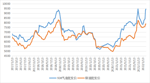 中国汽柴油批发价格指数周度均价走势图(单位:元/吨)