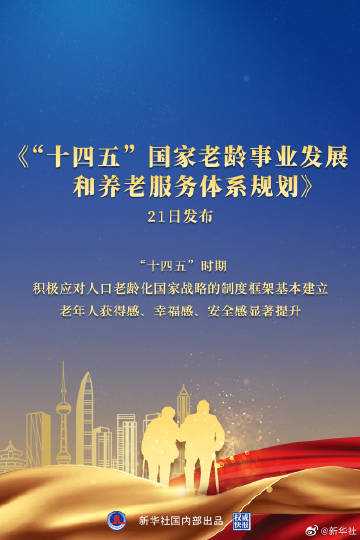 【权威快报|#十四五国家老龄事业发展和养老服务体系规划#发布】《“十四五”国家老龄事业发展和养老服务体系规划》21日发布。织牢兜底性养老服务网、扩大普惠型养老服务覆盖面、强化居家社区养老服务能力、完善老年健康支撑体系、大力发展银发经济、践行积极老龄观、#建设兼顾老年人需求的智慧社会#……“十四五”时期,积极应对人口老龄化国家战略的制度框架将基本建立,老年人获得感、幸福感、安全感显著提升。(记者安蓓、严赋憬,海报设计杨轶群)