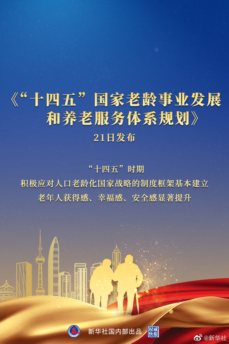 【权威快报丨《“十四五”国家老龄事业发展和养老服务体系规划》发布】《“十四五”国家老龄事业发展和养老服务体系规划》21日发布。织牢兜底性养老服务网、扩大普惠型养老服务覆盖面、强化居家社区养老服务能力、完善老年健康支撑体系、大力发展银发经济、践行积极老龄观、建设兼顾老年人需求的智慧社会……“十四五”时期,积极应对人口老龄化国家战略的制度框架将基本建立,老年人获得感、幸福感、安全感显著提升。(记者安蓓、严赋憬,海报设计杨轶群)