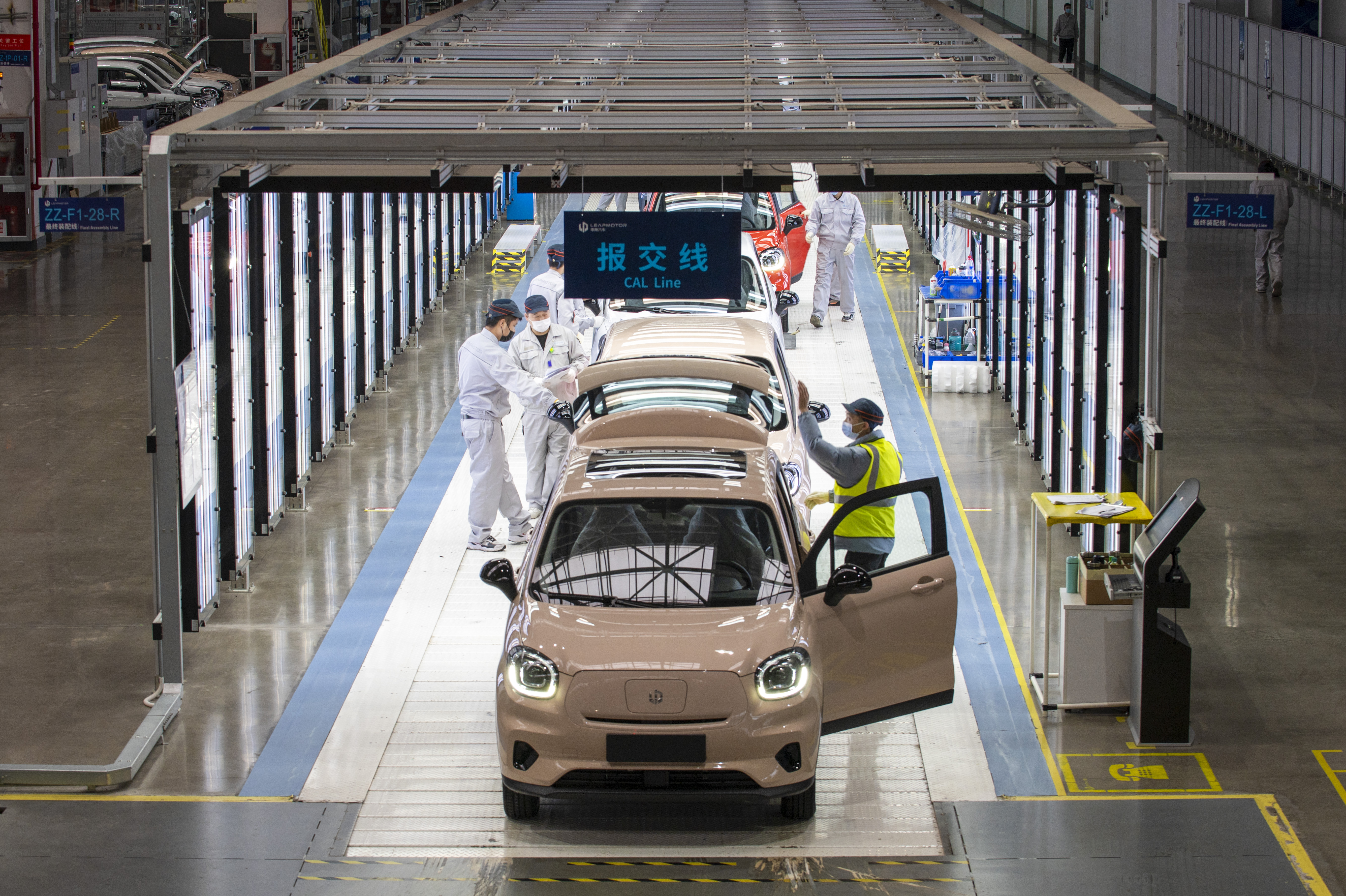 2021年12月17日,在浙江省金华市新能源汽车小镇一家汽车有限公司的总装车间内,员工有序工作。新华社发(胡肖飞 摄)