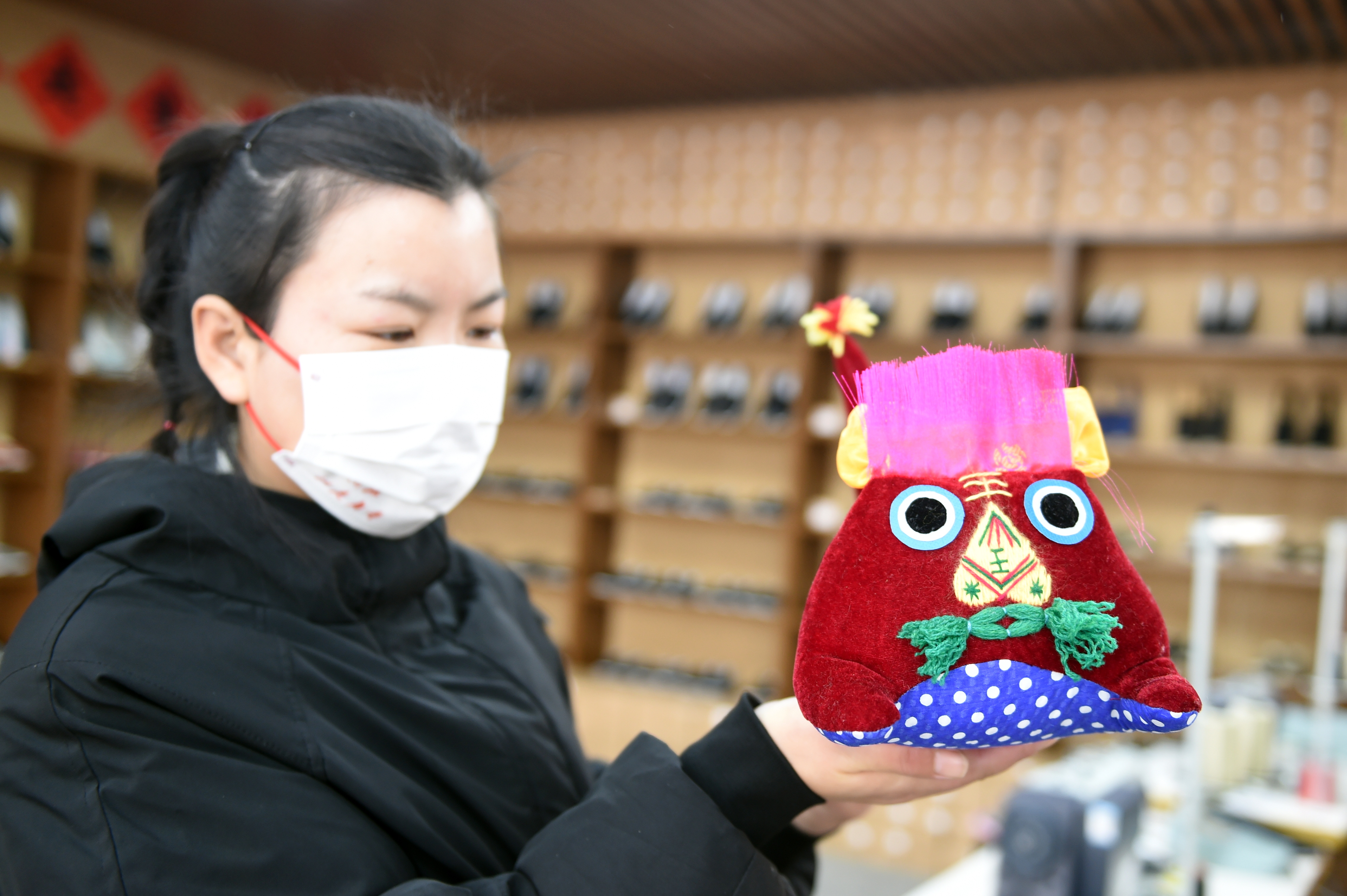 新华社照片,北京,2022年2月21日 砥砺前行 共创未来——2022新开局看“奋进中国”新图景 1月28日,在河北省平山县西柏坡镇北庄村电商直播助农惠农展销基地,工作人员展示特色商品。 (配本社同题文字稿) 新华社记者 骆学峰 摄