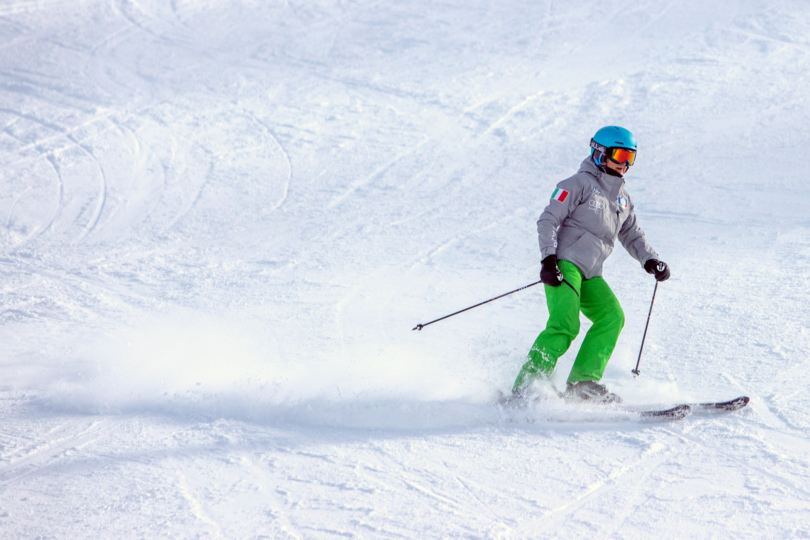 新华社照片,科尔蒂纳丹佩佐(意大利),2022年2月21日 (北京冬奥会·图文互动)(2)从北京接旗,2026相约意大利 在意大利科尔蒂纳丹佩佐,冰雪运动爱好者在高山滑雪场滑雪(2月18日摄)。 (配本社同题文字稿) 新华社记者 刘咏秋 摄