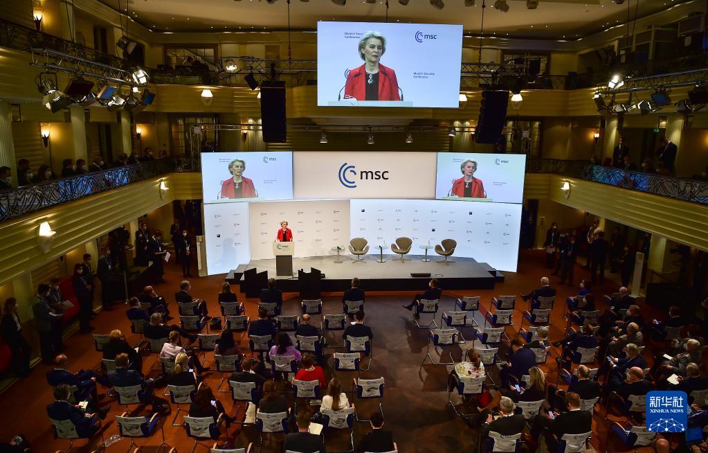 2月19日,在德国慕尼黑,欧盟委员会主席冯德莱恩在第58届慕尼黑安全会议(慕安会)上发言。新华社记者逯阳摄