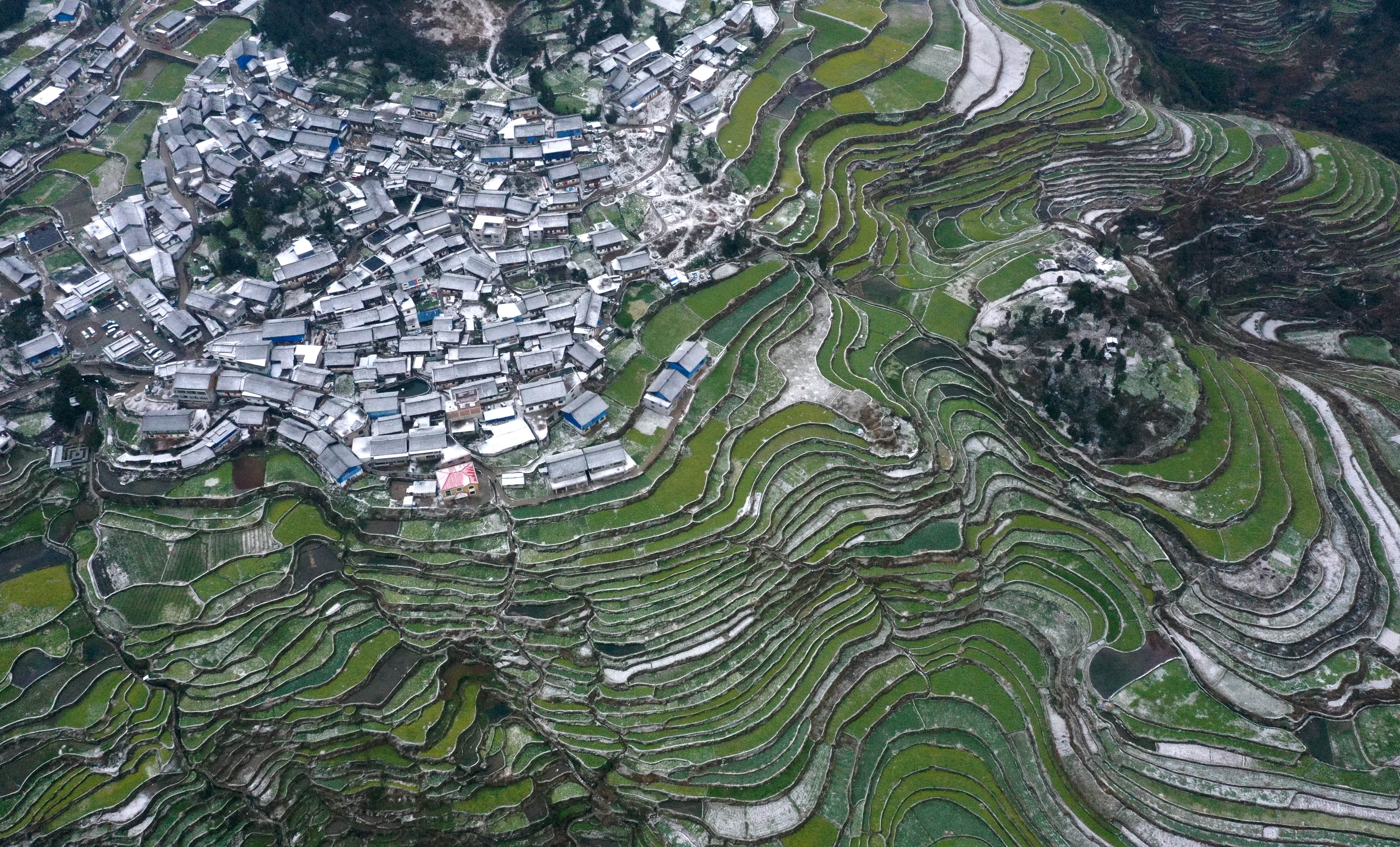 新华社照片,丹寨(贵州),2022年2月21日 多地迎来降雪 2月21日拍摄的贵州省黔东南苗族侗族自治州丹寨县龙泉镇高要苗寨梯田雪后景色(无人机照片)。 近日,我国部分地区出现降雪。 新华社发(黄晓海 摄)