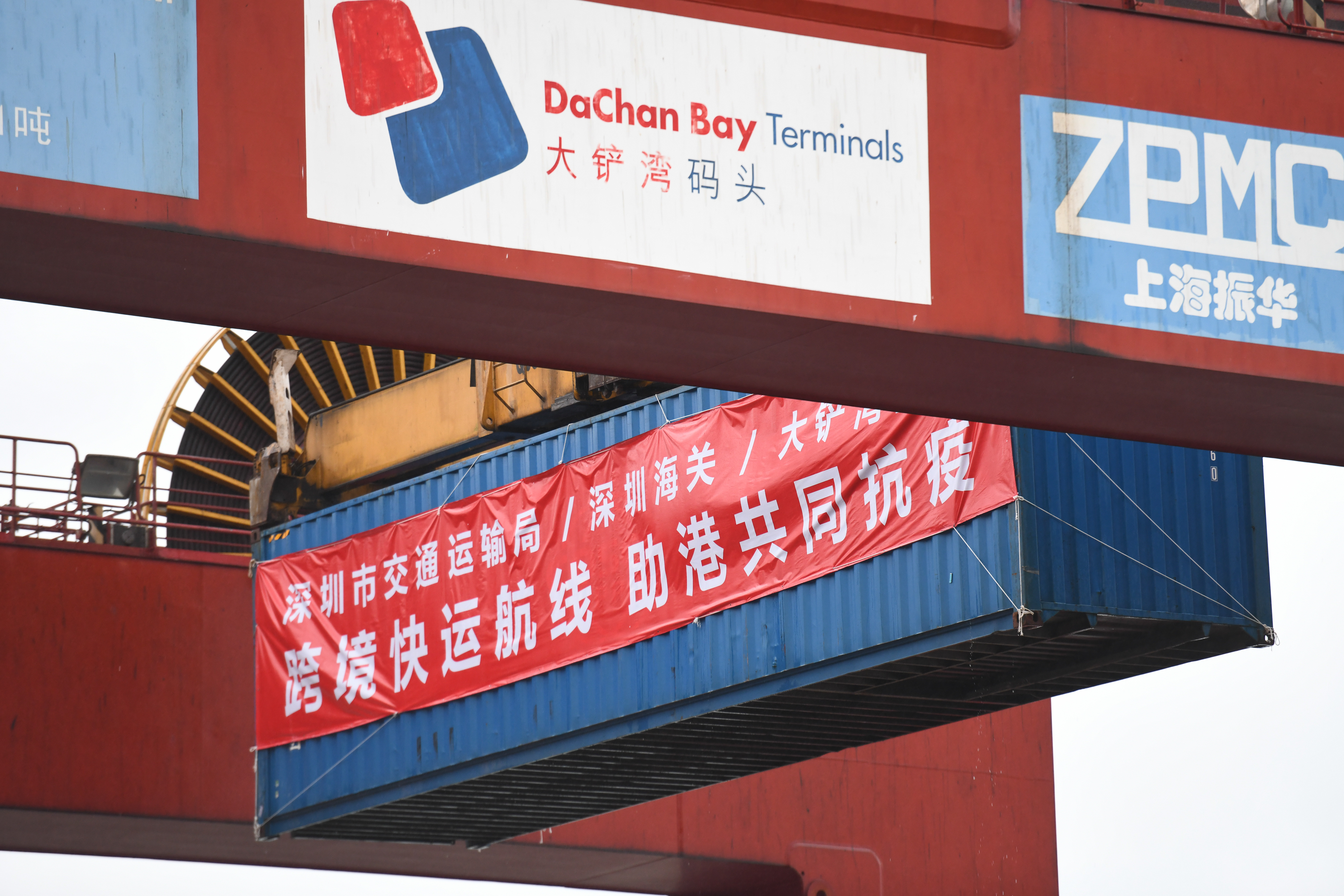 新华社照片,深圳,2022年2月21日 深圳开通“海上快线”全力保障香港生活物资供应 2月21日,在深圳大铲湾码头,满载供港蔬菜、水果、鸡蛋的集装箱吊装上船。 当日,深圳港大铲湾、妈湾、盐田集装箱港区全面开通供港物资水路运输快速通道,优化流程、提升效率,全力保障香港同胞生活物资供应。 新华社记者 梁旭 摄