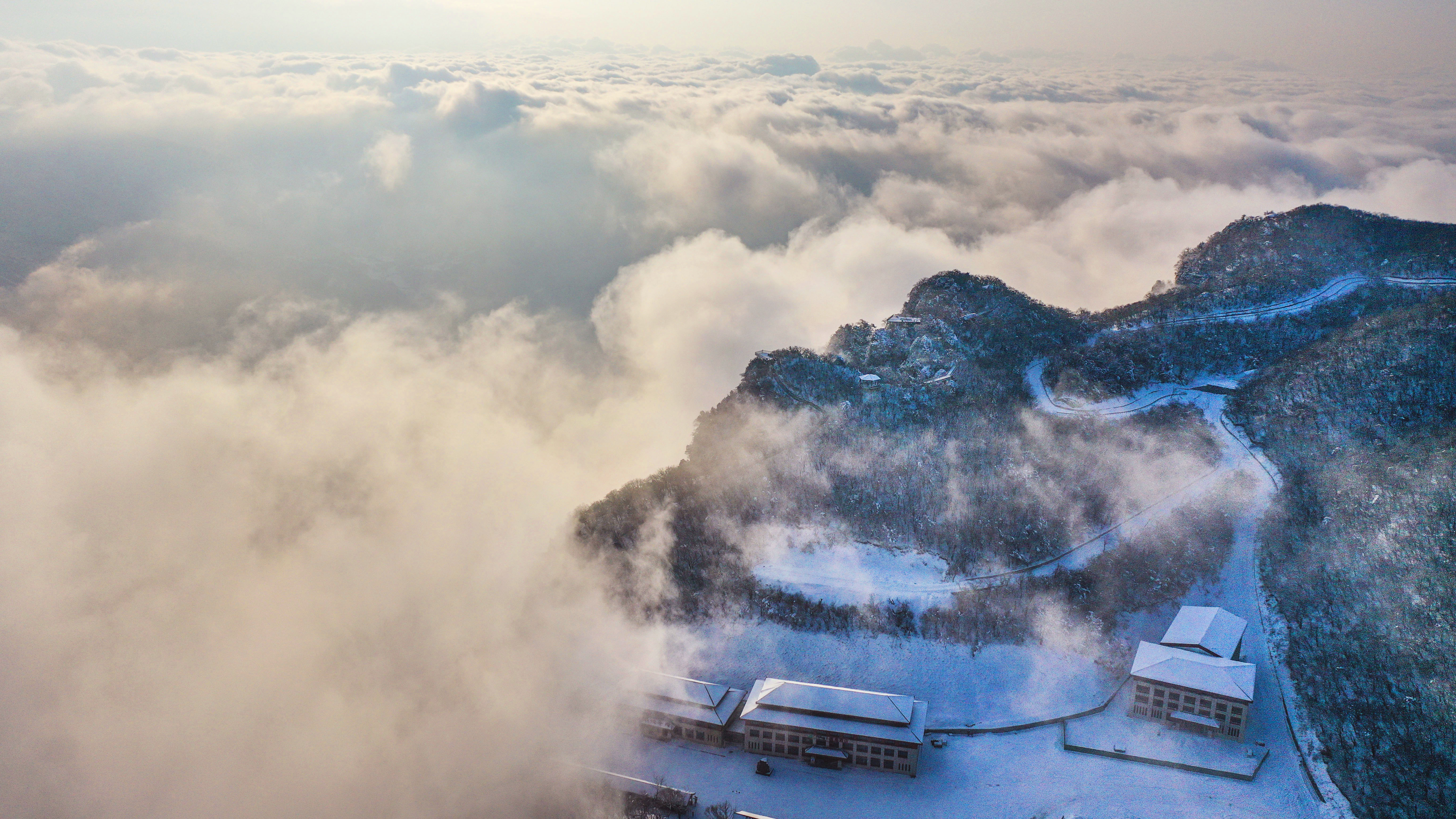 新华社照片,汉中(陕西),2022年2月21日 陕西汉中:龙头山雪中仙境 2月21日,汉中市龙头山景区的云海与晚霞相辉映(无人机照片)。 近日,陕西省汉中市龙头山景区连续降雪,银装素裹,吸引不少游人前来赏景。 新华社记者 陶明 摄