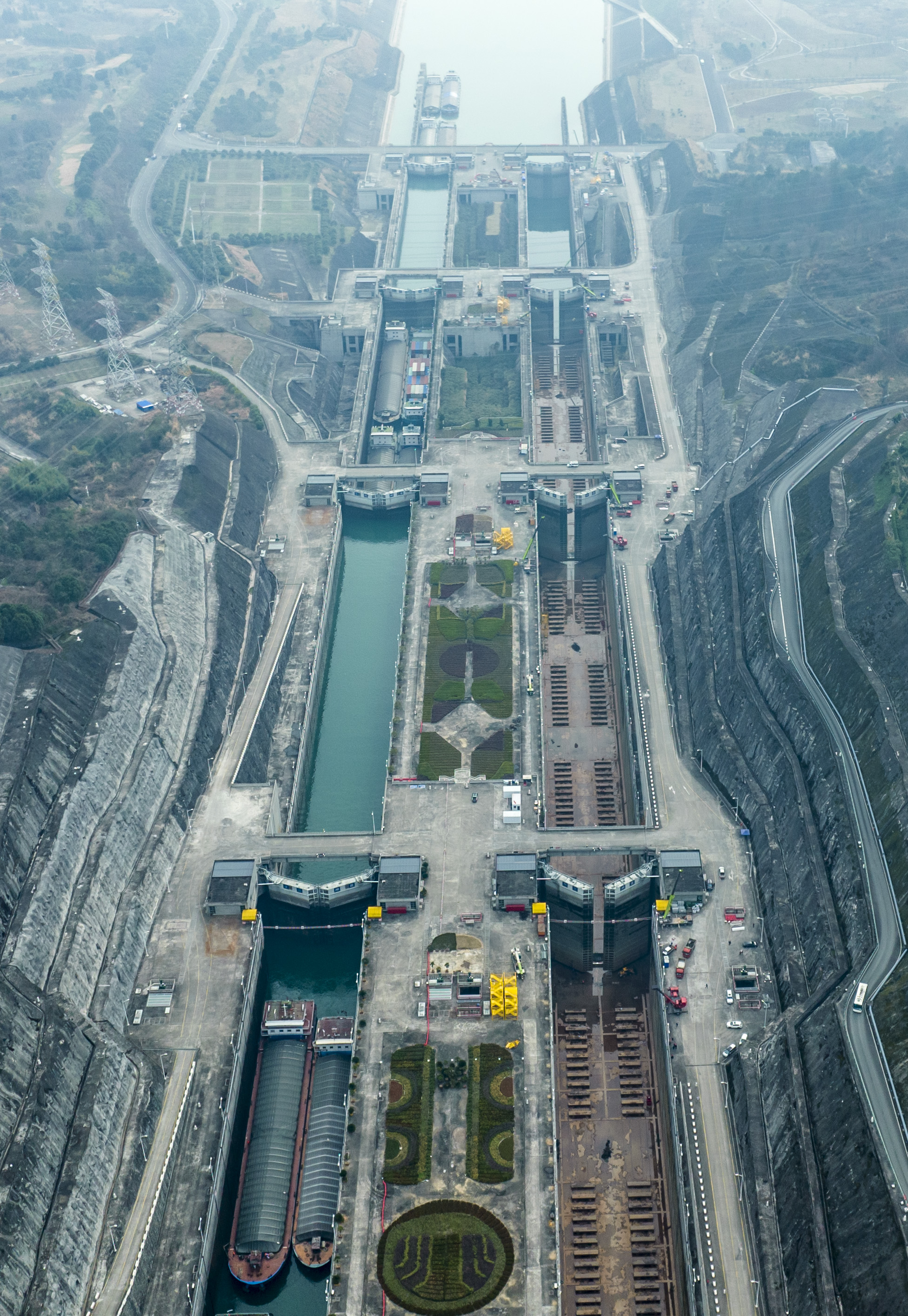 新华社照片,宜昌(湖北),2022年2月21日 工期30天,三峡南线船闸停航检修 2月21日拍摄的三峡五级船闸全景(无人机照片)。 从2月21日8时起,三峡南线船闸开始停航实施计划性检修施工,工期30天。南线船闸停航期间,北线船闸继续运行。 新华社发(郑家裕 摄)