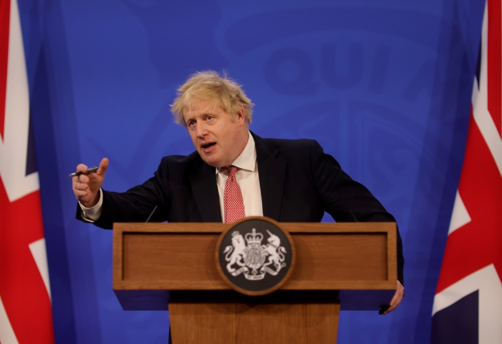 2月21日,在英国伦敦,英国首相约翰逊在新闻发布会上讲话。(新华社发,英国首相府供图)