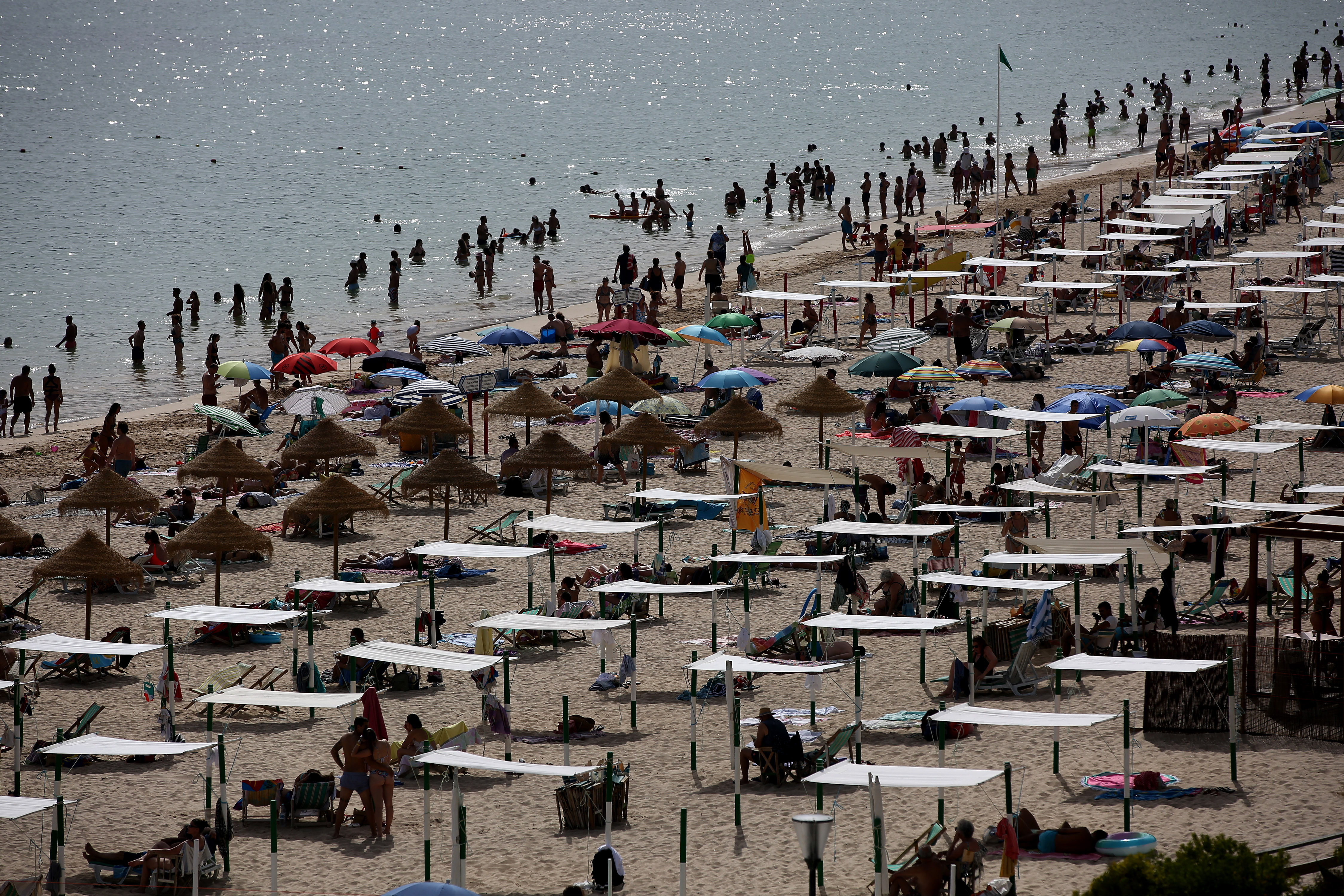2021年7月10日,人们在葡萄牙塞辛布拉海边游乐、休息。(新华社发,佩德罗·菲乌萨摄)