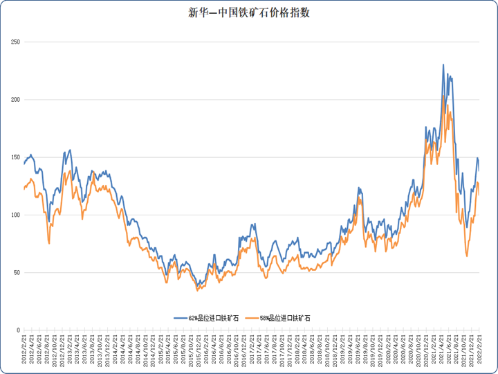 新华财经北京2月22日电(郑豪)新华—中国铁矿石价格指数显示,2月15日至2月21日间,进口铁矿石价格弱势运行。数据显示,2月21日,我国62%品位进口铁矿石价格指数为138,较2月14日下跌6.12%;58%品位进口铁矿石价格指数为117,较2月14日下跌7.87%。