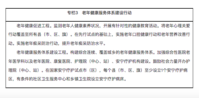 规划提出,鼓励大型或主要接收失能老年人的养老机构内部设置医疗卫生机构,将养老机构内设医疗卫生机构纳入医联体管理;实施社区医养结合能力提升行动;推进“互联网+医疗健康”“互联网+护理服务”“互联网+康复服务”,发展面向居家、社区和机构的智慧医养结合服务。