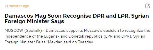【环球网报道】据俄罗斯卫星网刚刚消息,叙利亚外交部长费萨尔·梅克达德22日表示,大马士革支持莫斯科方面承认“顿涅茨克人民共和国”和“卢甘斯克人民共和国”独立的决定,并称叙利亚可能很快也将承认乌东“两国”。